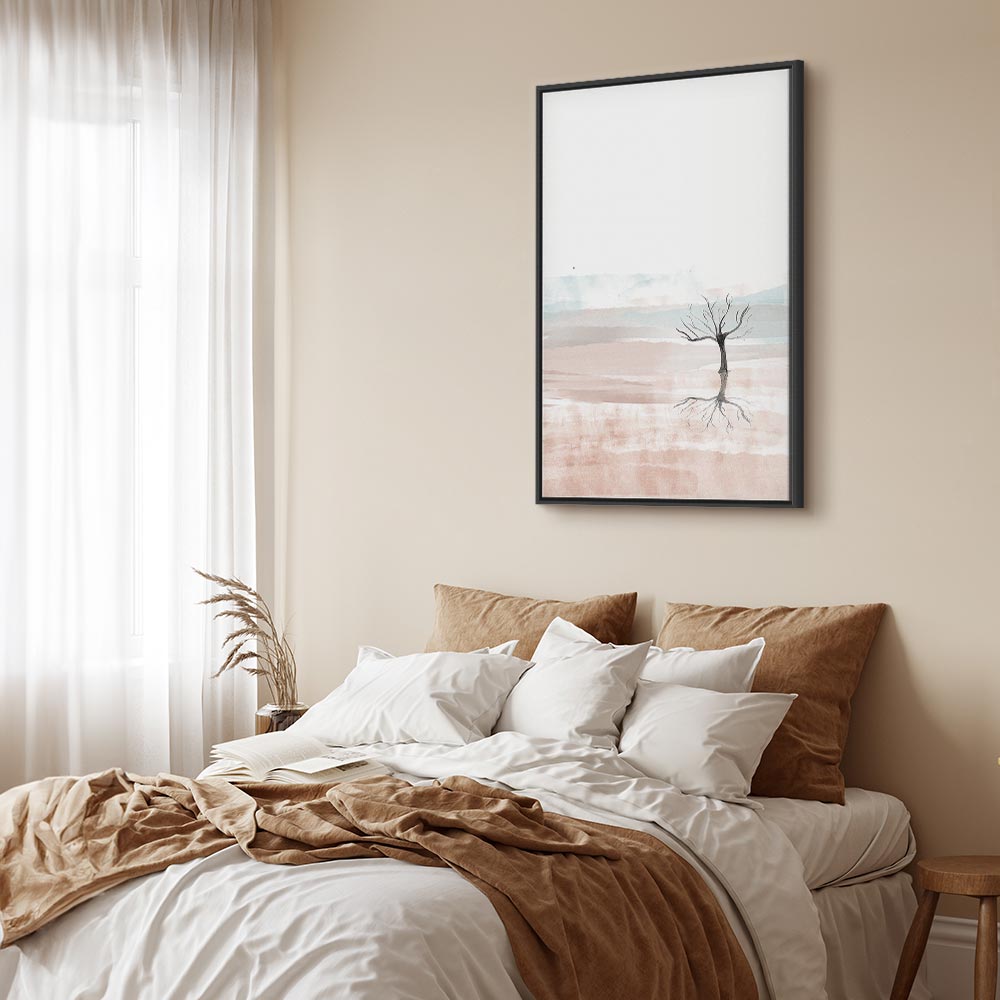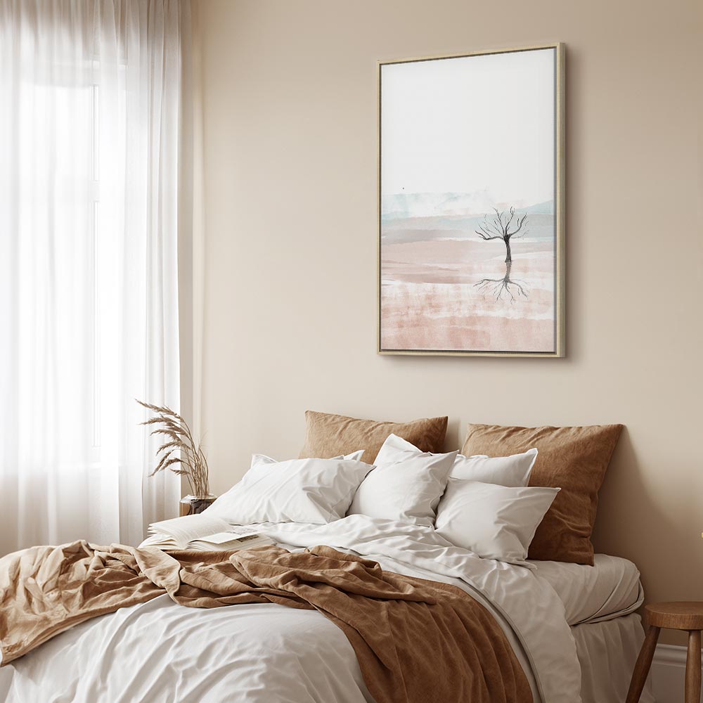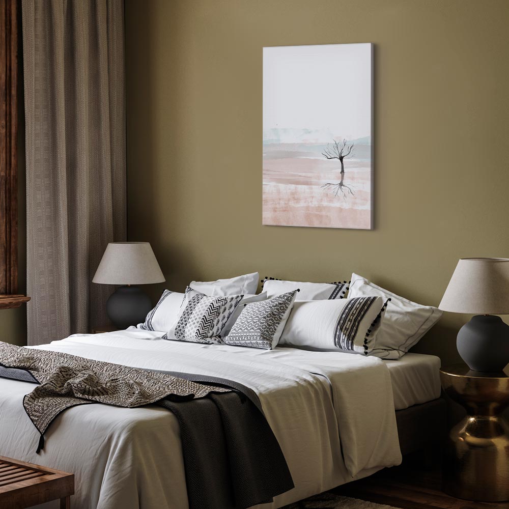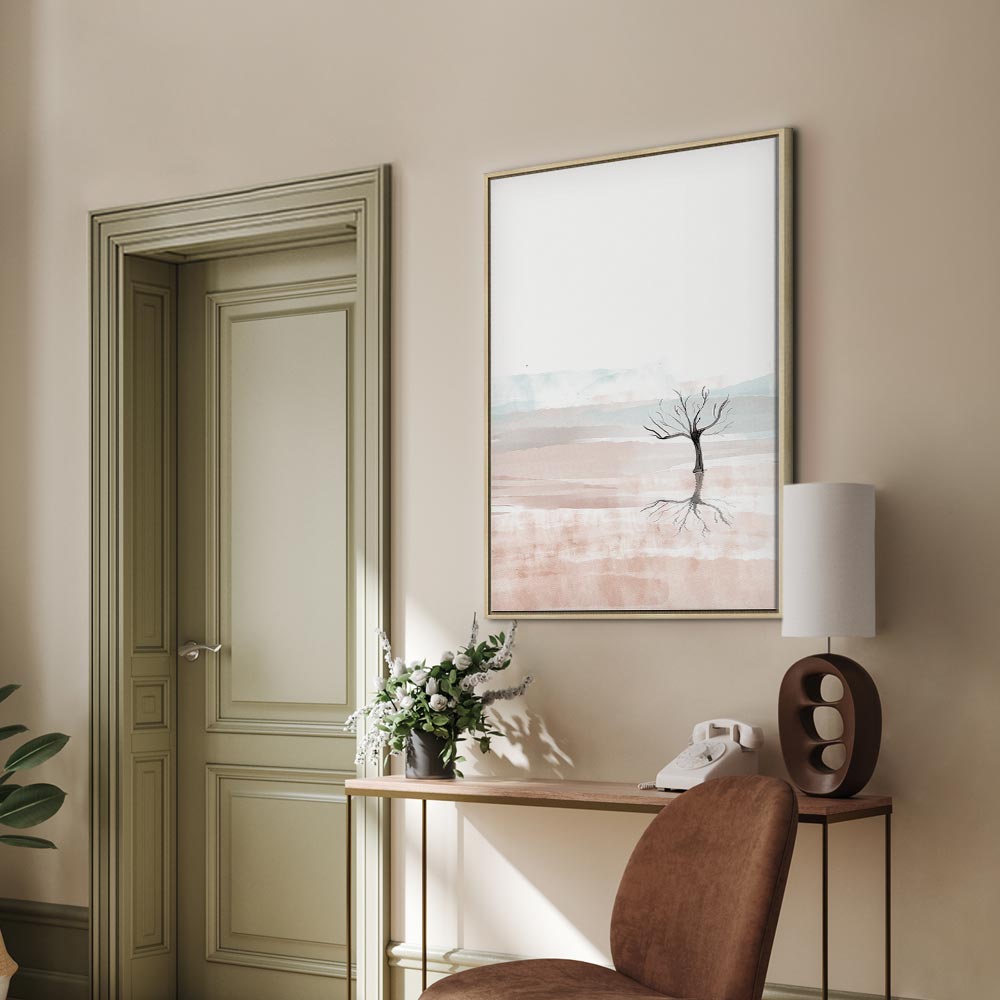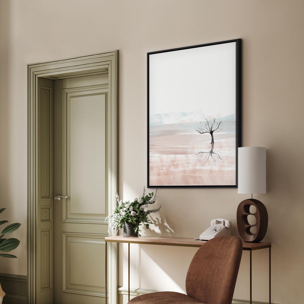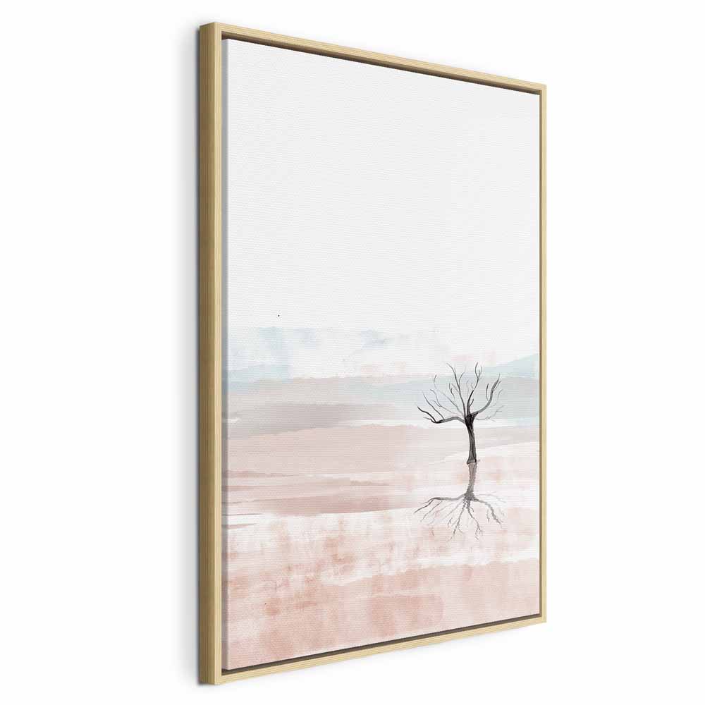 This canvas print with a motif of a solitary tree reflected in the calm surface of water captivates with its lightness, silence and subtle elegance. The delicate composition in shades of powder pink, light beige, grey and soft blue brings harmony and a sense of space into the interior. It is a unique decoration for the living room, bedroom, hallway, office or hotel, ideal for modern, minimalist and Scandinavian interiors. This wall art helps create a calm, refined atmosphere and becomes a beautiful accent for spaces inspired by nature and gentle colour palettes.