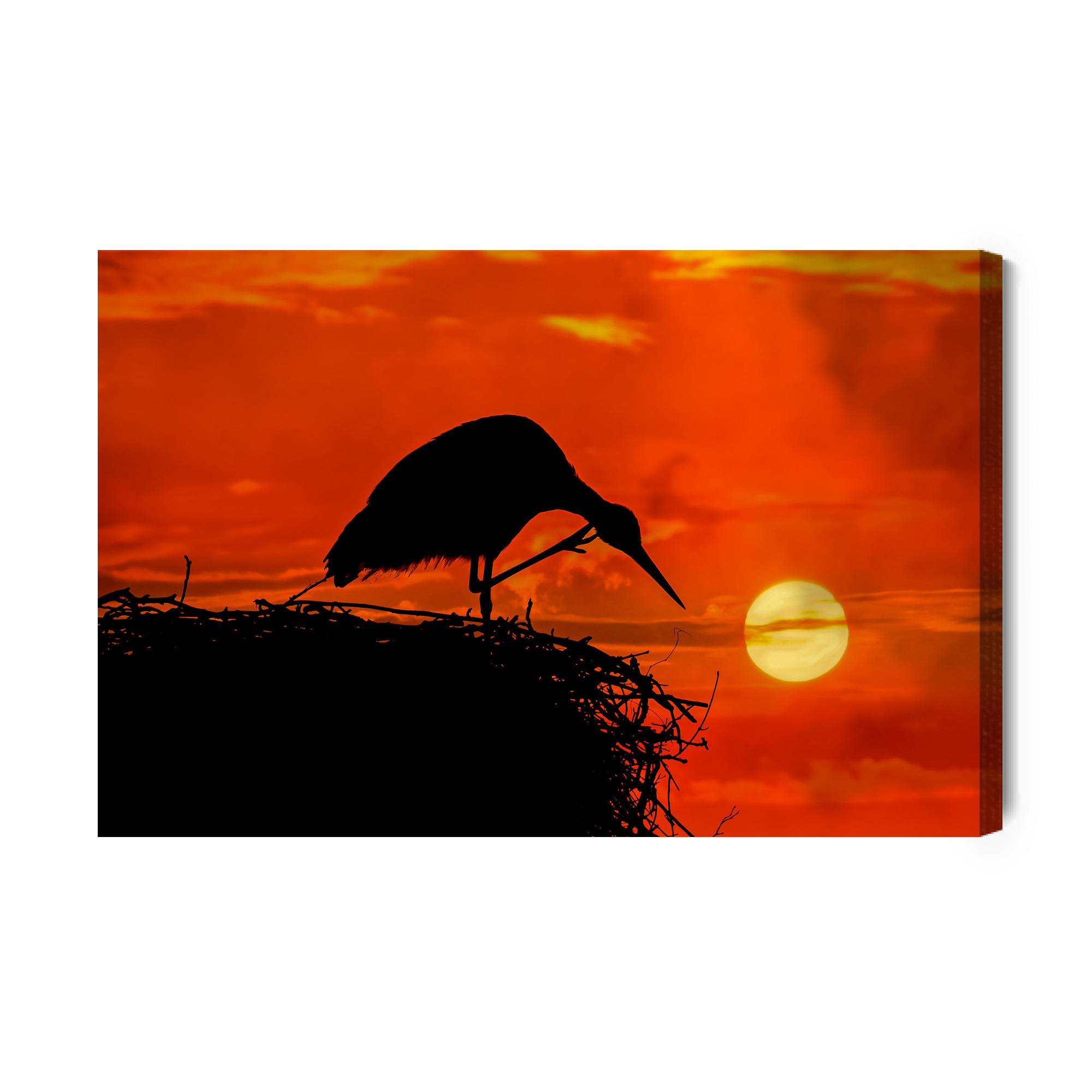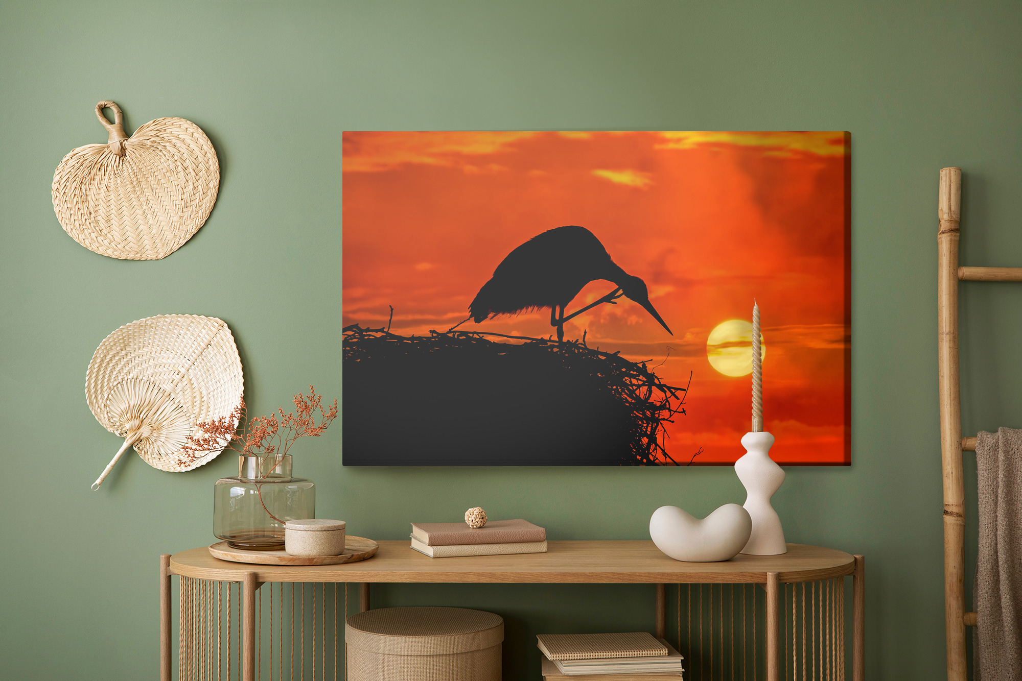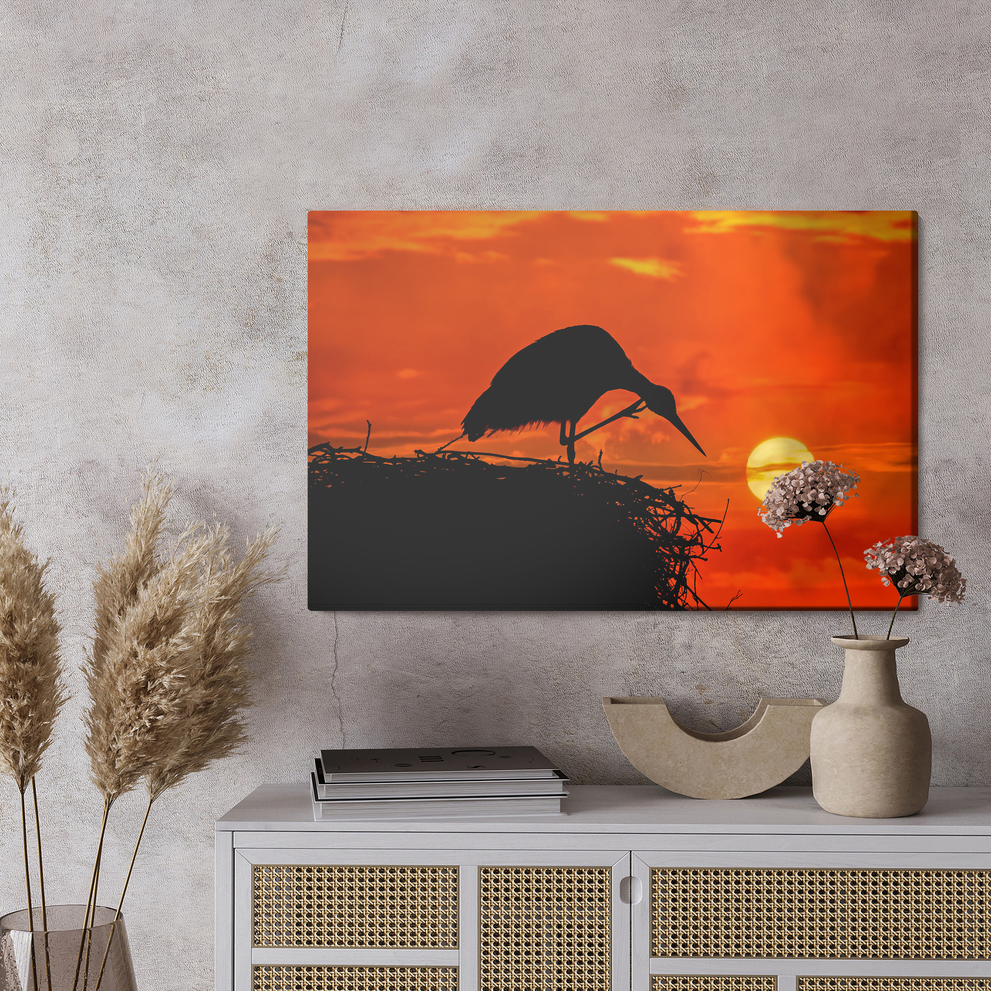 This canvas wall art captivates with simplicity and strong mood—showing a black silhouette of a bird standing on a nest against an intense orange sky and a round sun low on the horizon. Contrast is the key here: the deep black foreground cuts sharply into the heated sunset tones, making the composition bold, elegant and instantly eye-catching. The minimalist framing turns the scene into a powerful décor accent—no clutter, just atmosphere and emotion. It’s a canvas print in a photography style, ideal for anyone who loves modern living room wall art and expressive wall décor.