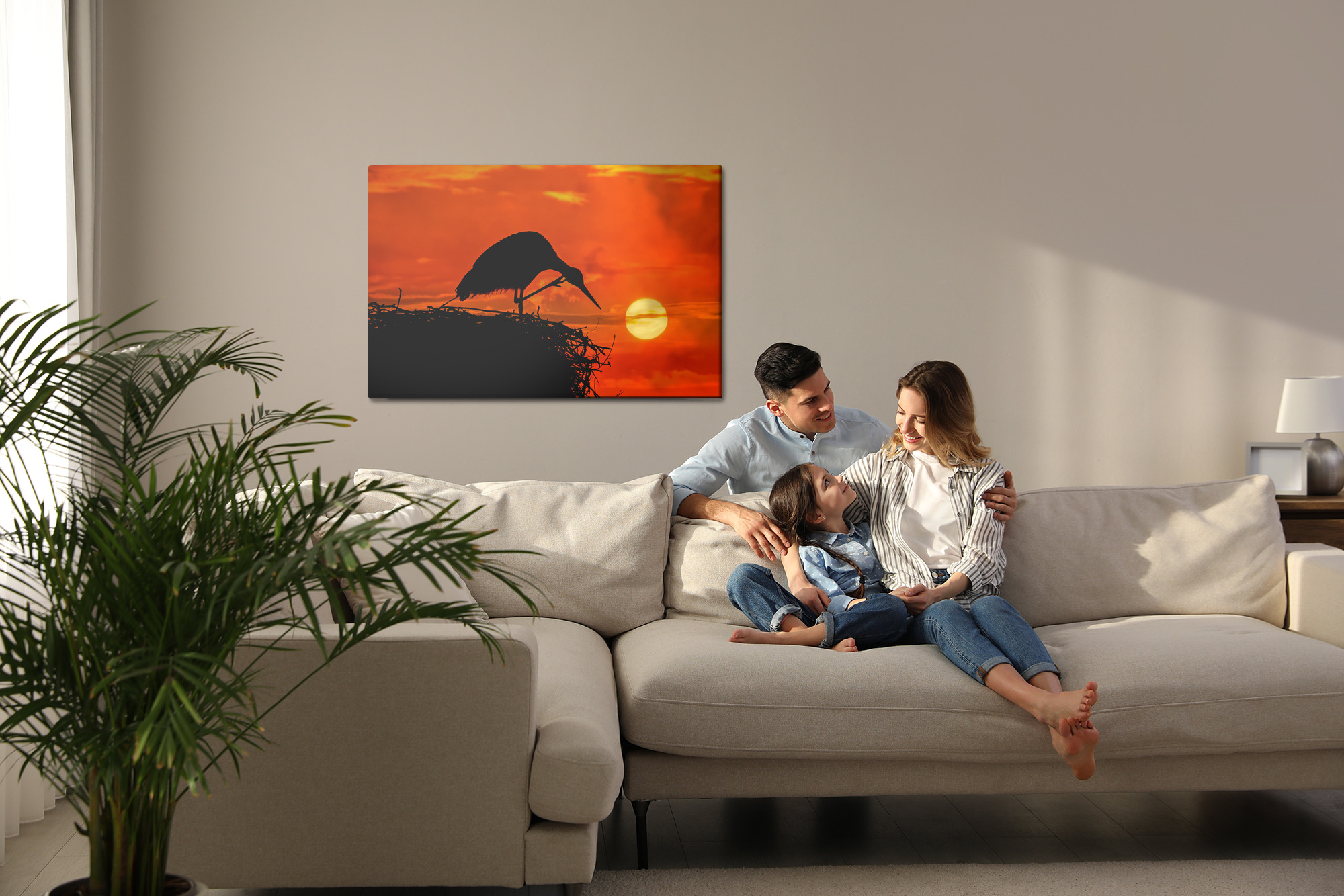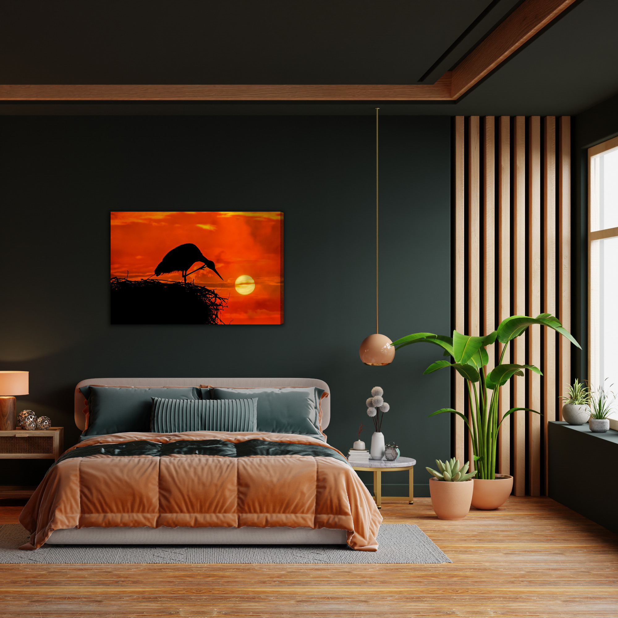 The palette is warm and intense: shades of red, orange and gold dominate, balanced by the black silhouette and nest. This combination warms up the interior and creates a calm evening ambience, while still adding energy. As wall art for the living room, it looks great above a sofa or sideboard, especially in interiors with black accents, wood, brick or metal details. In the bedroom, it brings a romantic, soothing tone; in the hallway, it makes a strong first impression; and in an office, it becomes an elegant background that supports focus. The nature-and-sunset motif also fits hotels and restaurants beautifully, particularly if you want to add coziness and character to the space.