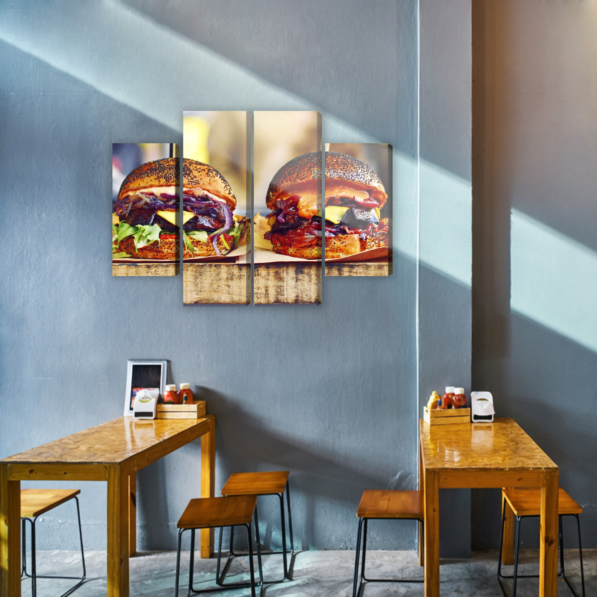 This four-panel canvas wall art is a bold, mouth-watering accent that grabs attention right away. The close-up shows juicy burgers with glossy sauce, layered toppings, cheese, lettuce, and a signature seeded bun. The softly blurred background keeps the focus on texture and color, while the four-panel split adds lightness and a modern rhythm. It’s a great choice if you enjoy strong food motifs and want wall decor that sets the mood without extra ornament.