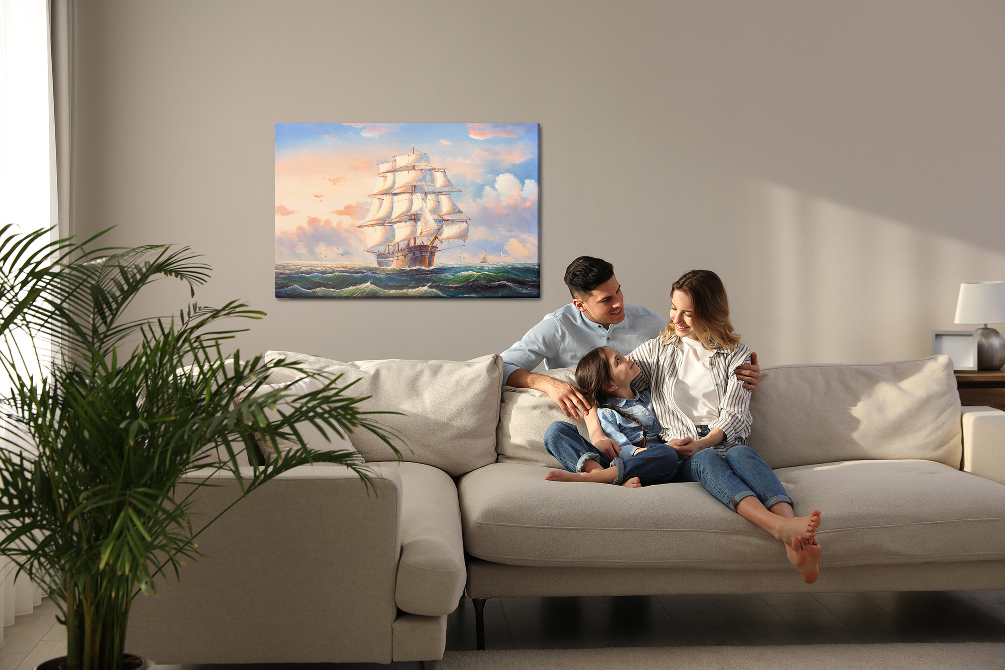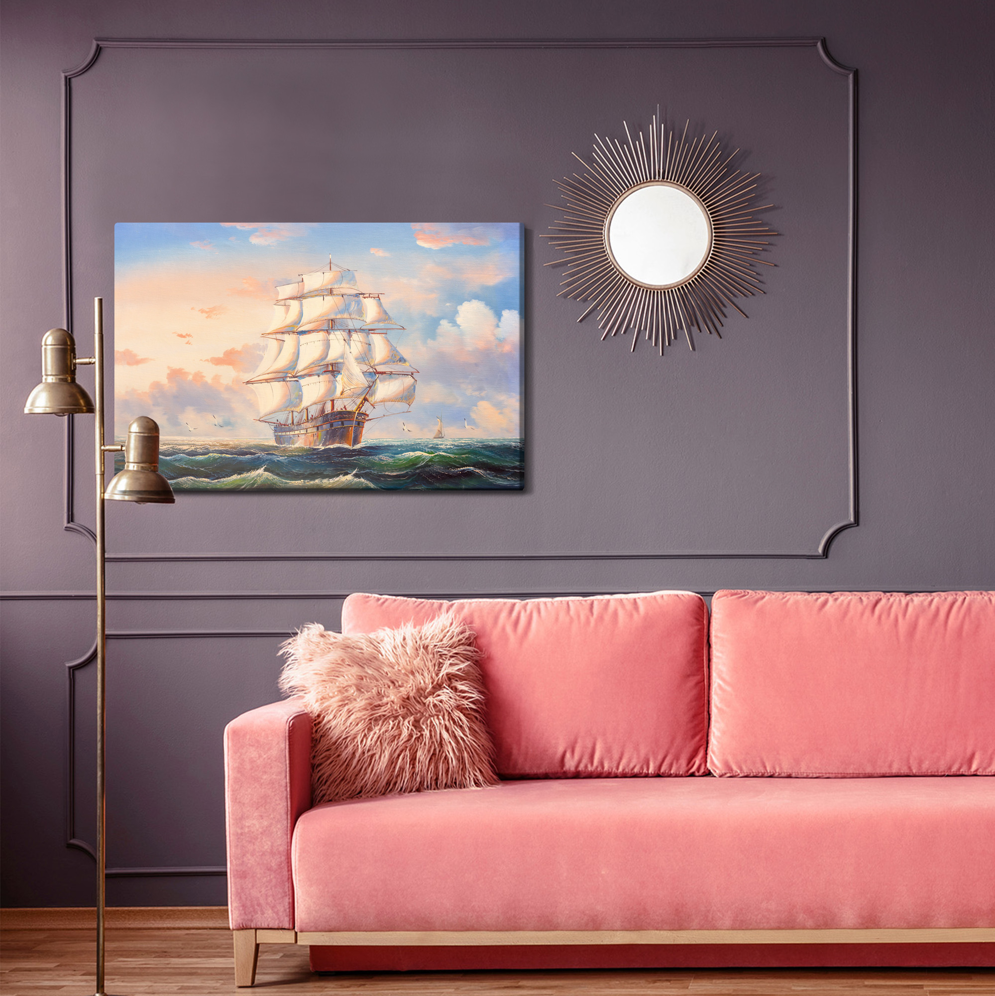 Bring a sense of travel and freedom into your interior: a majestic sailing ship with white sails glides over the waves, while the warm light of the sky gives the scene an airy feel. This canvas print in a painterly style stands out with its detail and motion, creating an elegant focal point on the wall. A pastel palette of blues, beiges and soft oranges, balanced with deep green waves, forms a harmonious contrast and visually opens up the space. Perfect as wall art for a living room, bedroom, office, hotel, restaurant or hallway when you want modern decor with a maritime theme.