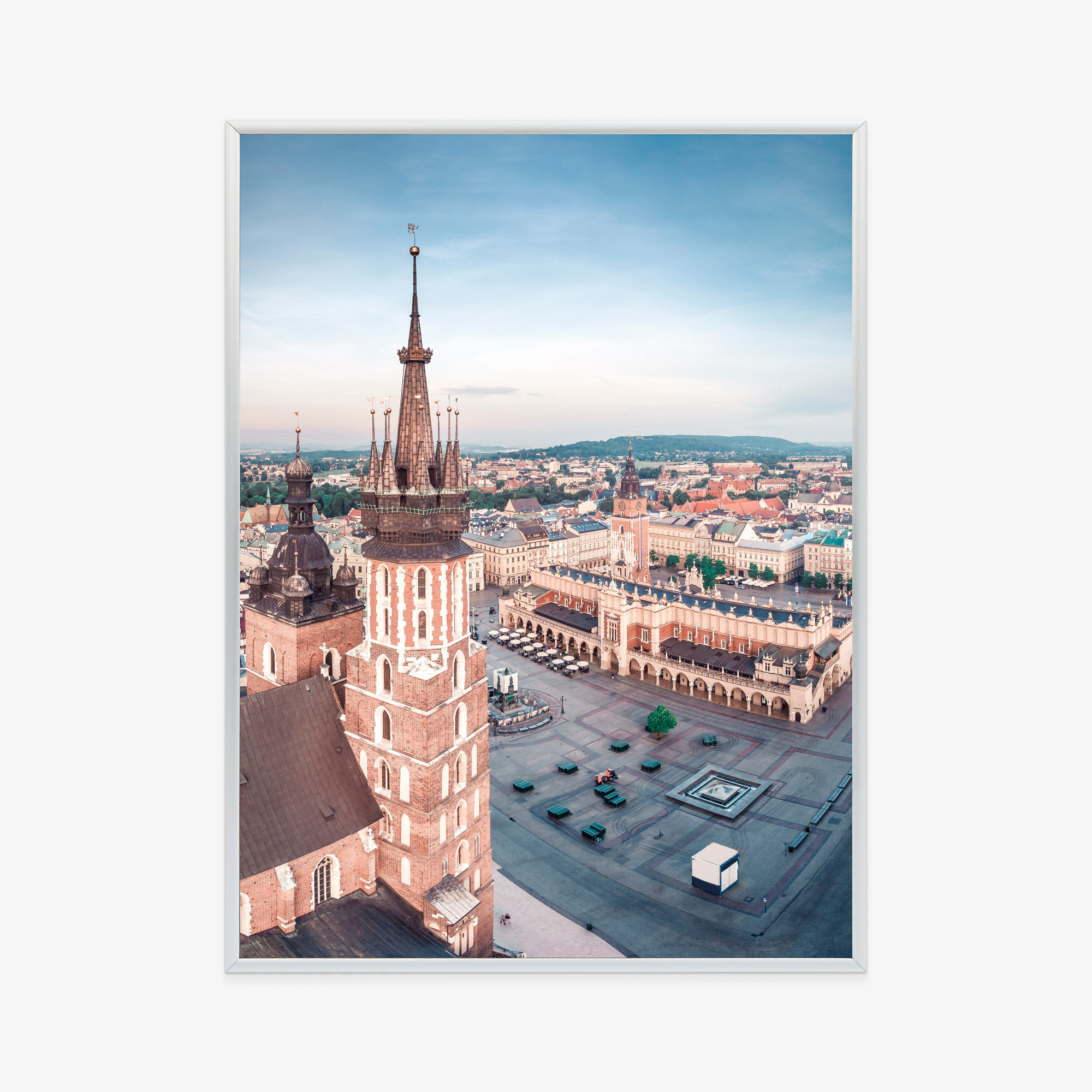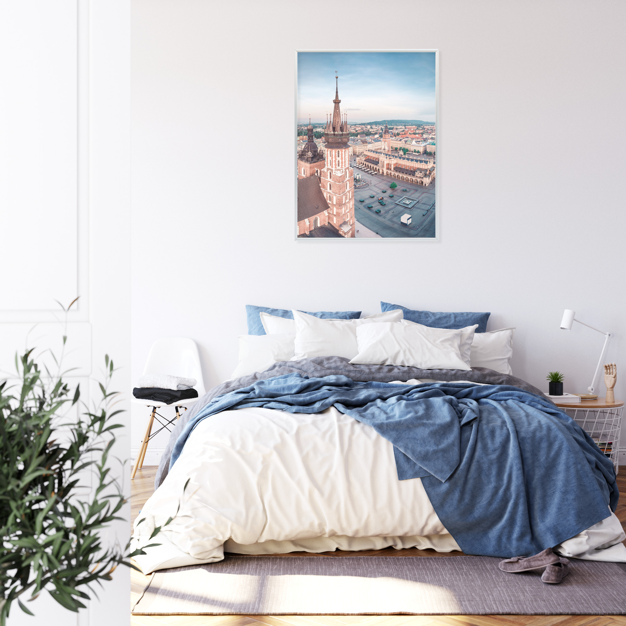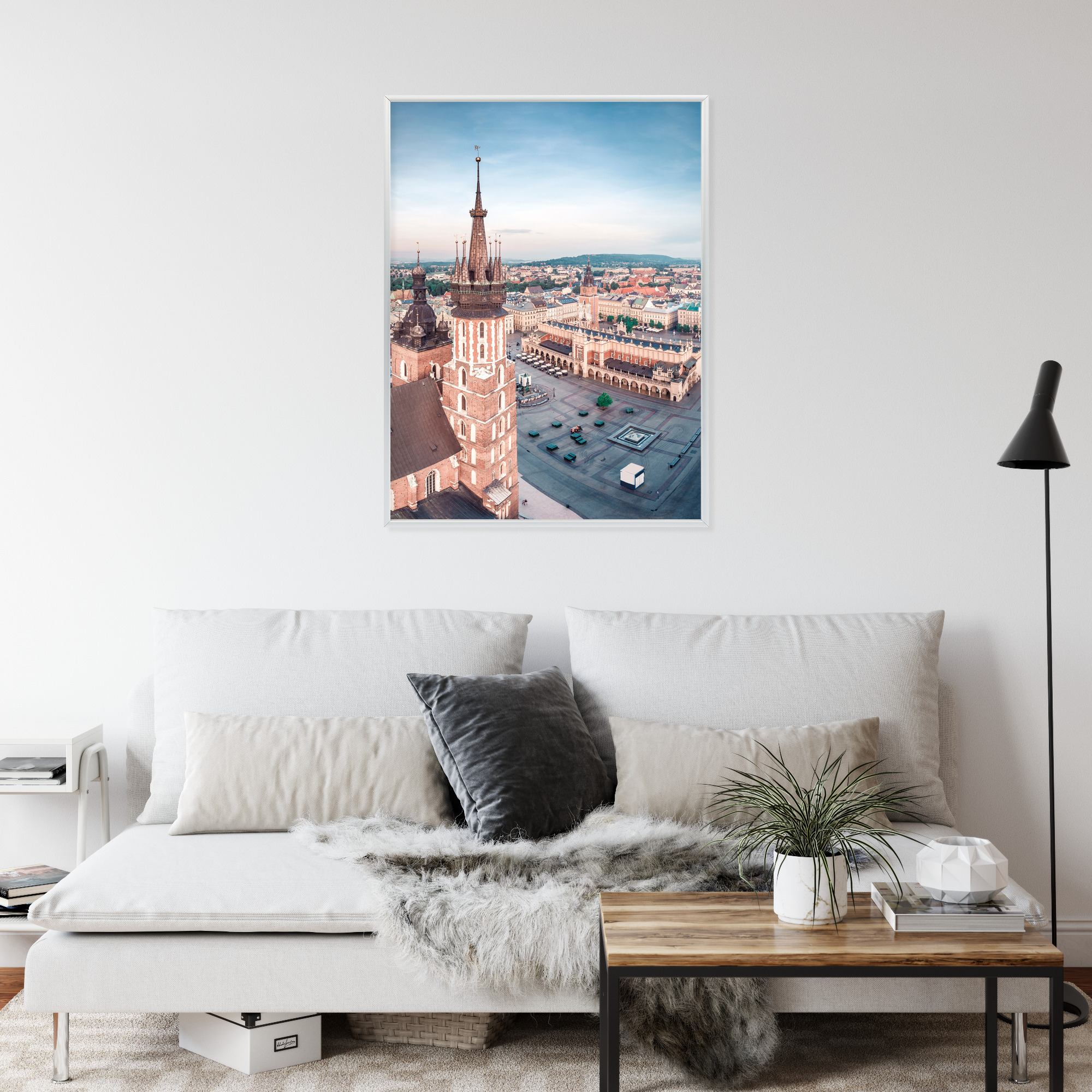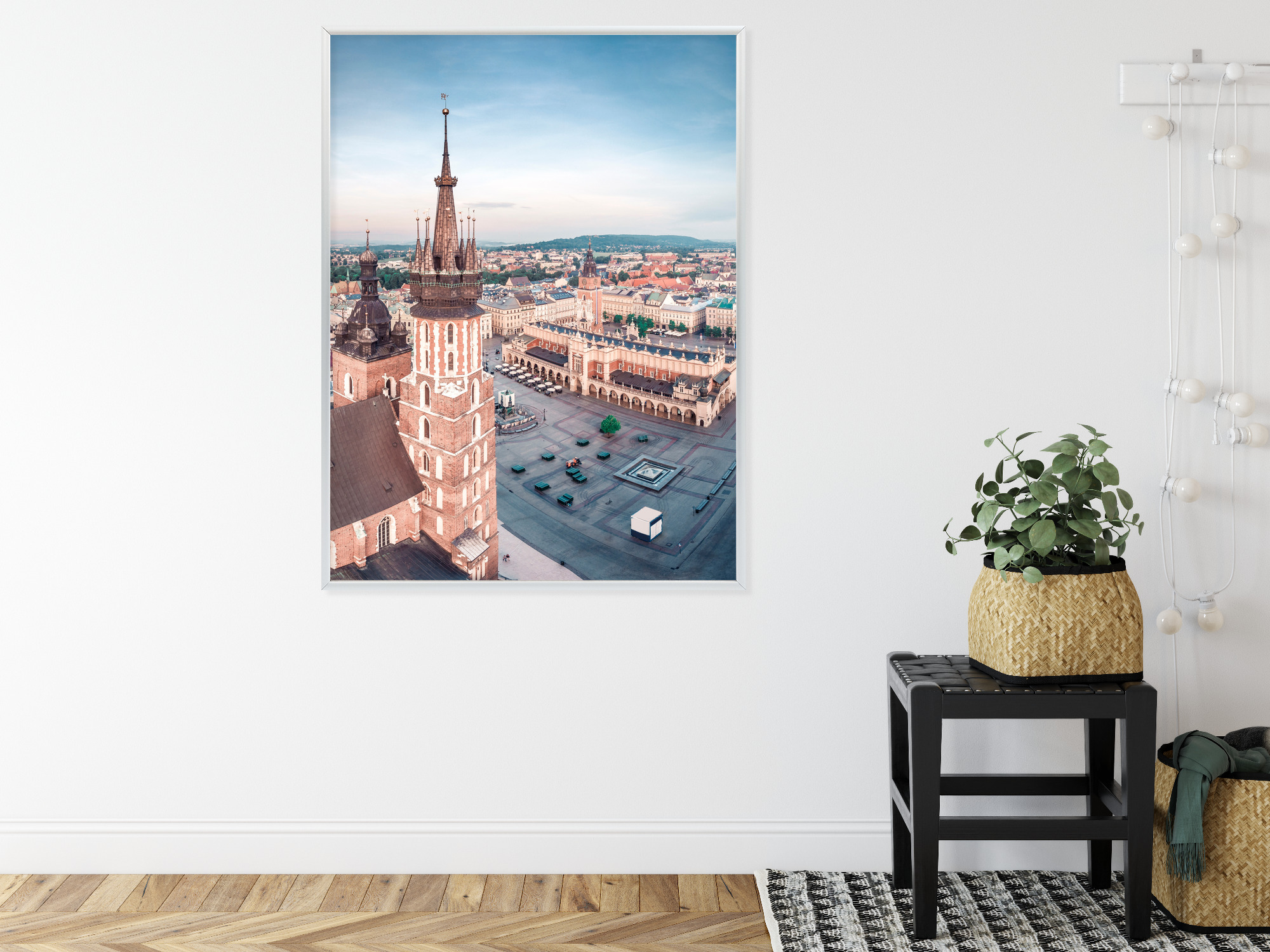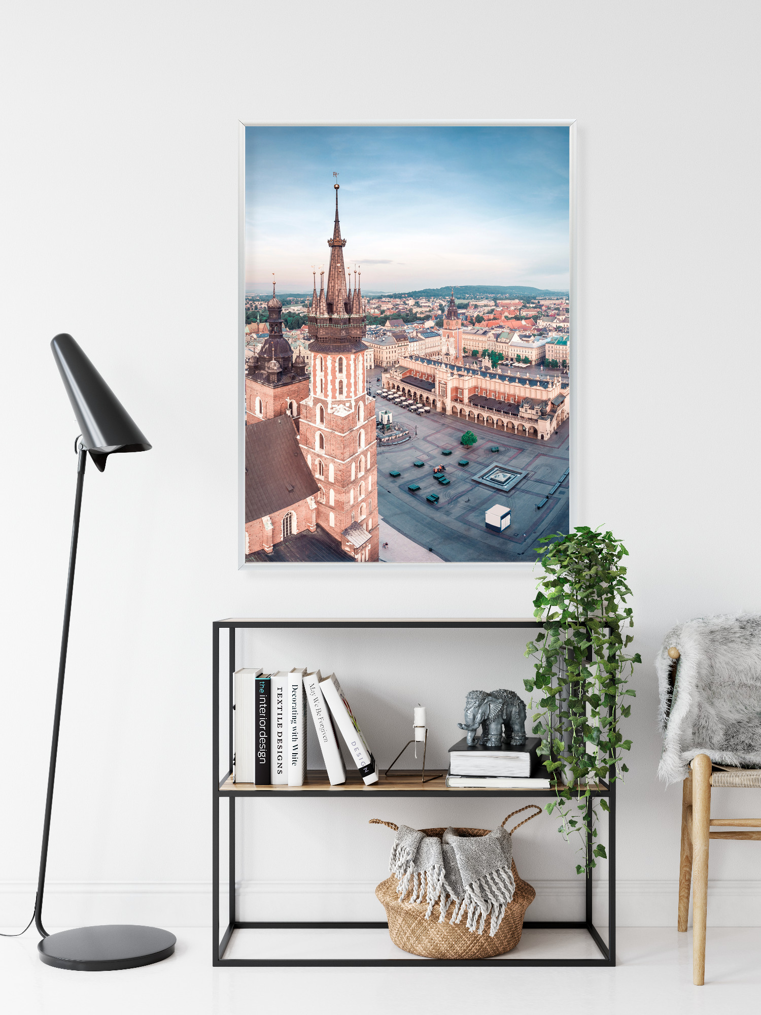 This photographic poster shows Krakow from a unique perspective: a view from near St. Marys Church tower across the Main Square and the Cloth Hall. The composition blends monumental architecture with a wide city panorama, adding a sense of space and a subtle travel vibe to your interior. The color palette is bright and pastel – blue sky, soft beige and gray tones of the square, and warm brick hues create a calm, elegant atmosphere. It is a great piece of wall art for a living room, bedroom, office, or hallway, and it also suits hotels and restaurants where a strong sense of place and style matters. If you are looking for a living room wall picture with a city view, this poster draws attention without overpowering the arrangement.