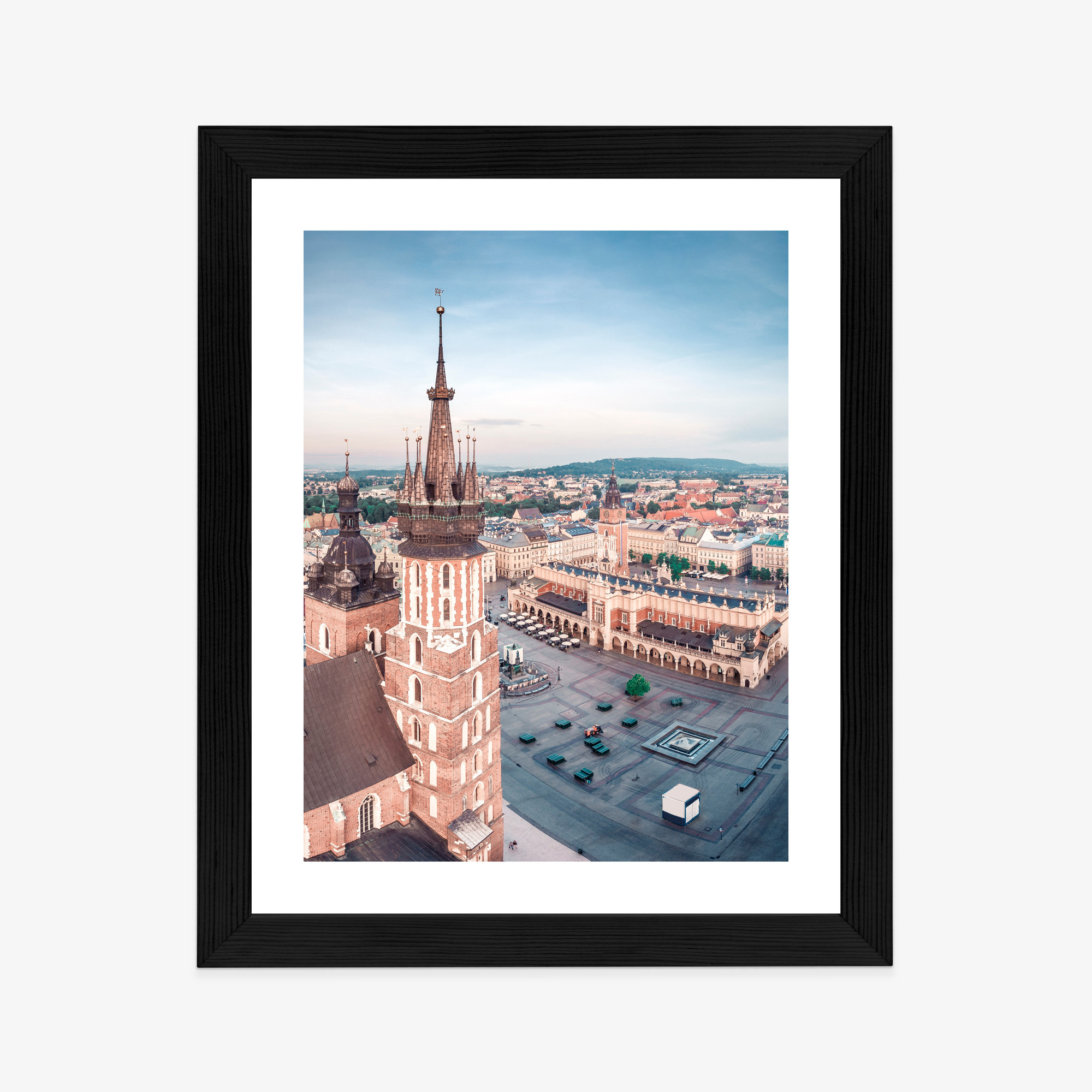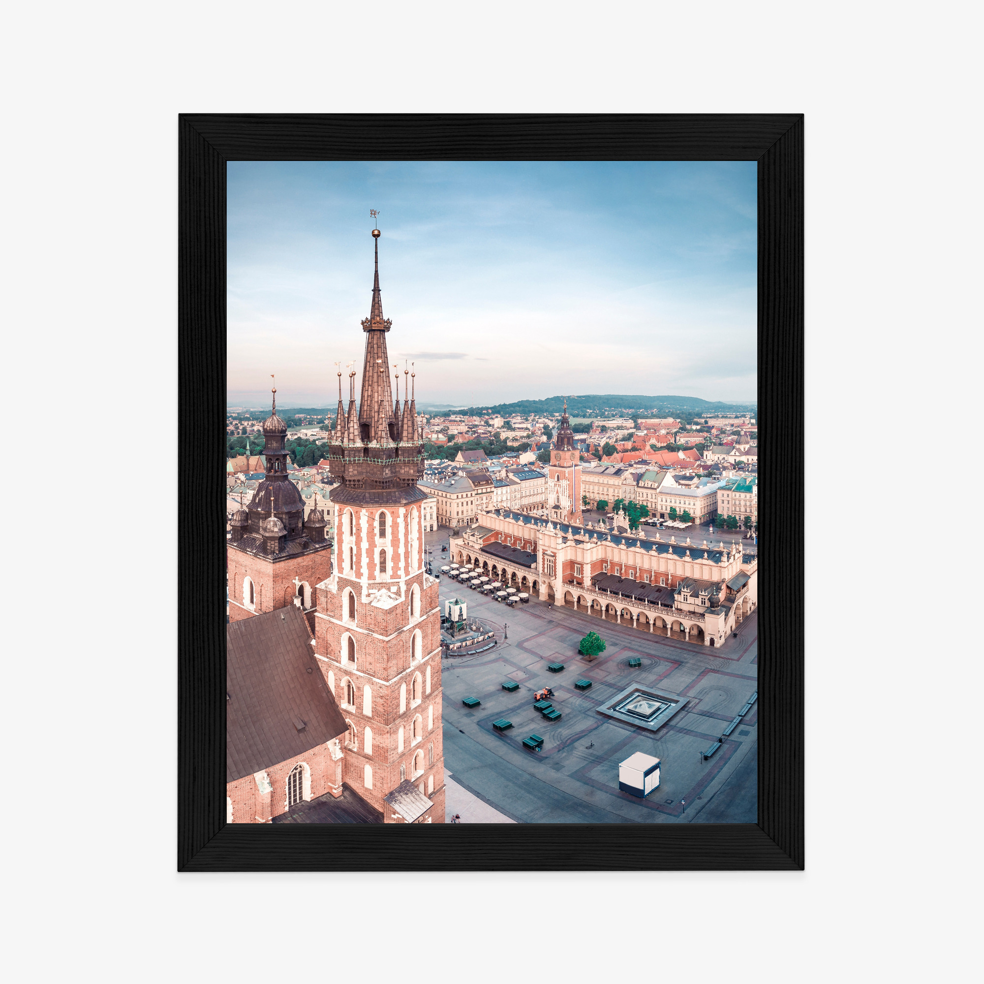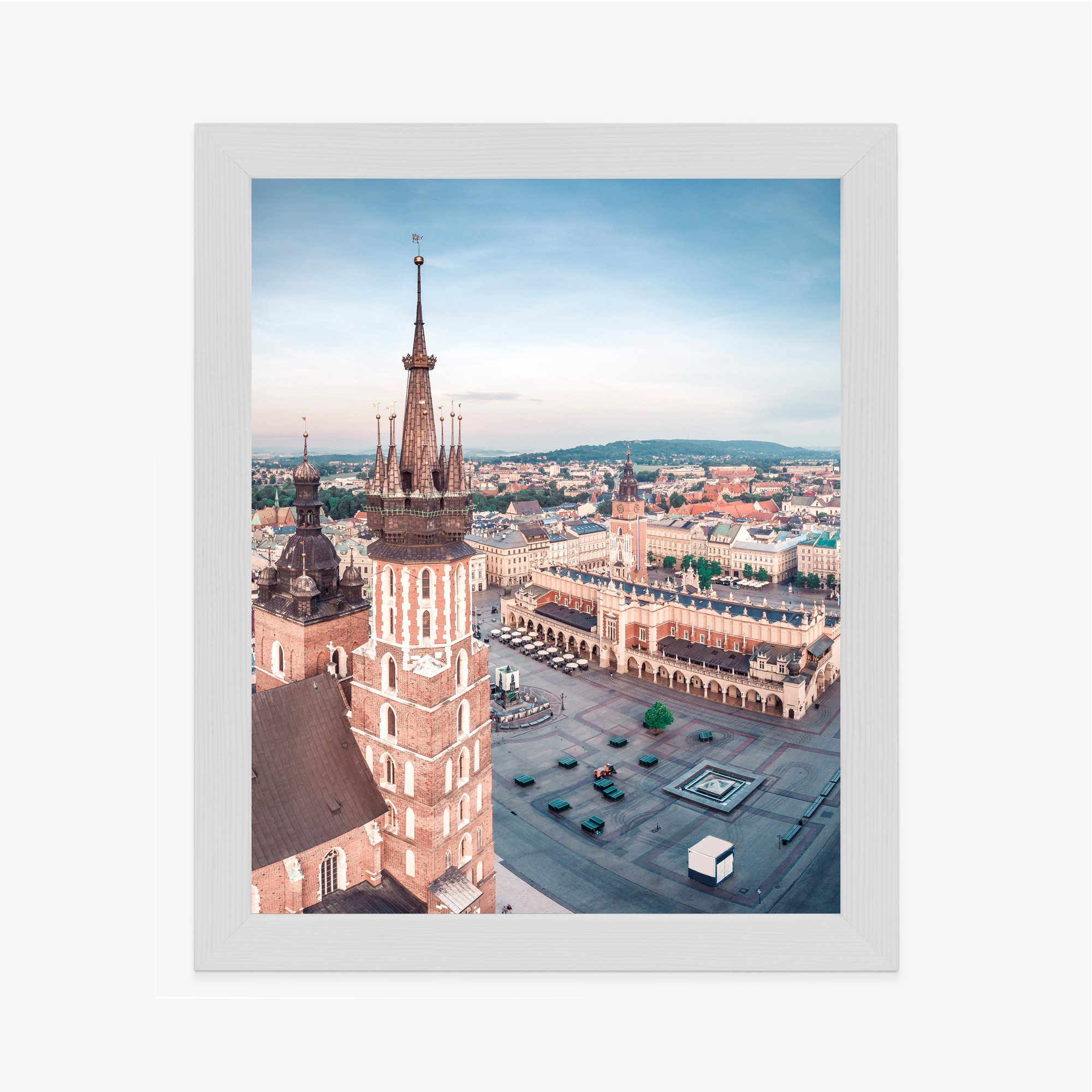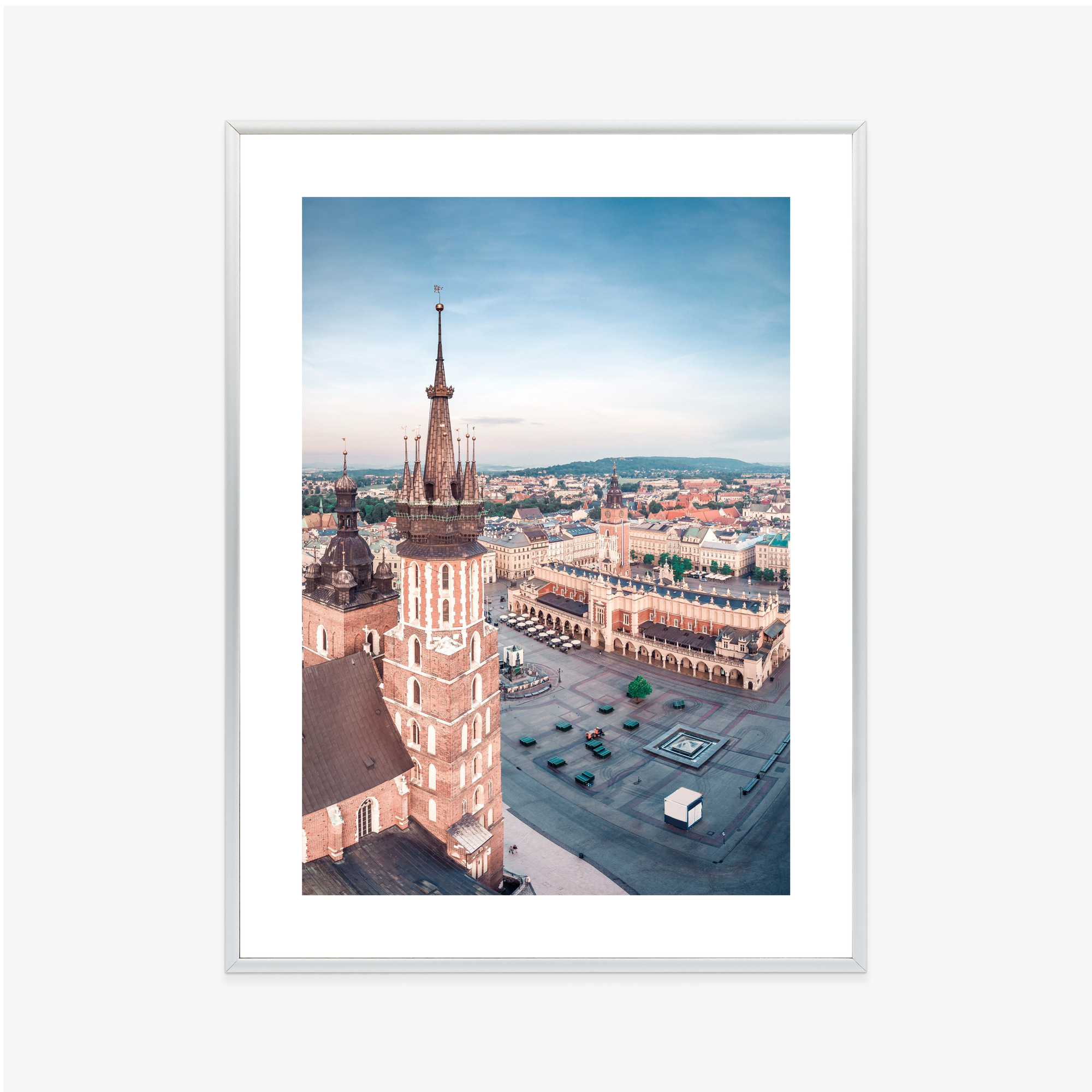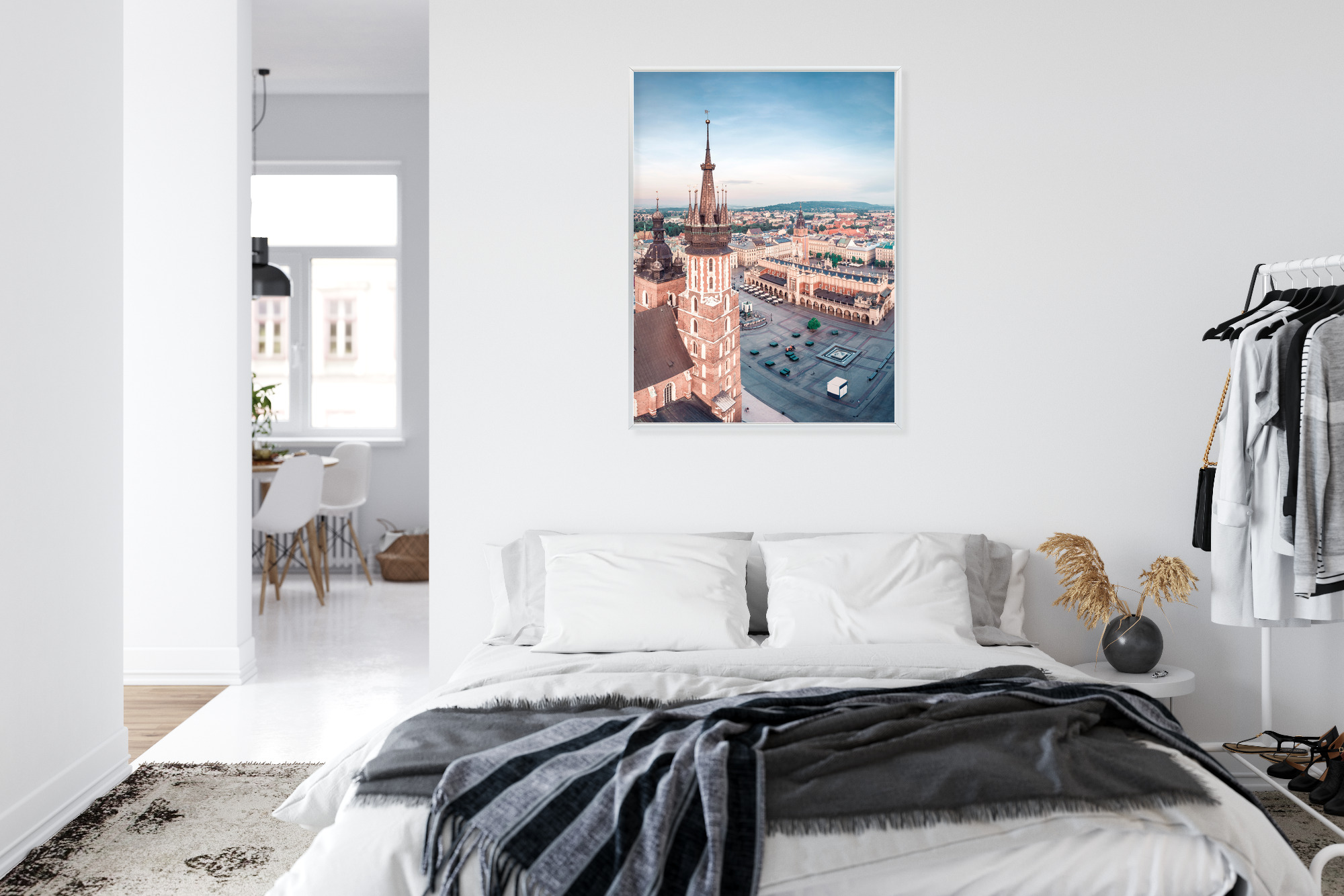 This photographic poster shows Krakow from a unique perspective: a view from near St. Marys Church tower across the Main Square and the Cloth Hall. The composition blends monumental architecture with a wide city panorama, adding a sense of space and a subtle travel vibe to your interior. The color palette is bright and pastel – blue sky, soft beige and gray tones of the square, and warm brick hues create a calm, elegant atmosphere. It is a great piece of wall art for a living room, bedroom, office, or hallway, and it also suits hotels and restaurants where a strong sense of place and style matters. If you are looking for a living room wall picture with a city view, this poster draws attention without overpowering the arrangement.