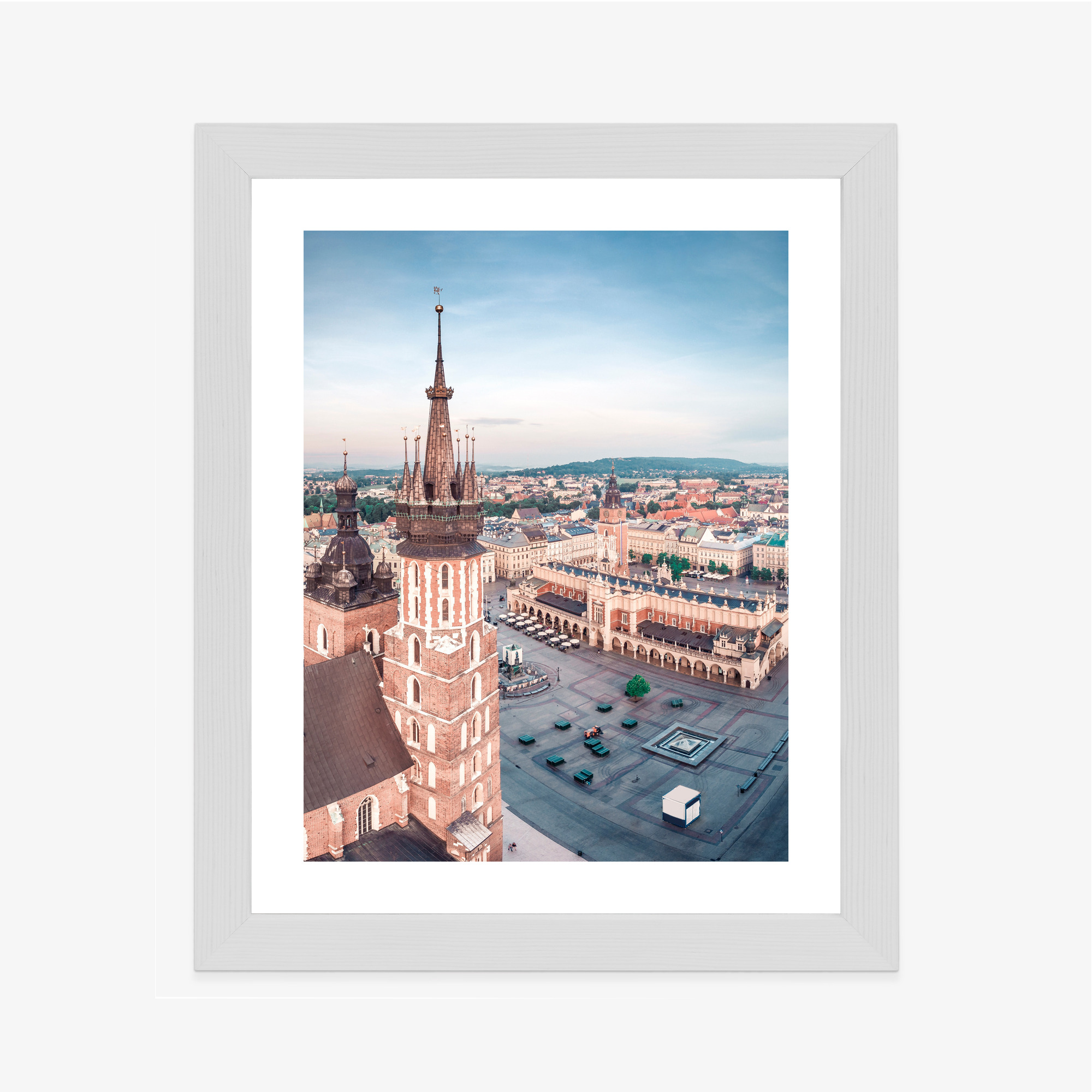 Bright, pastel Krakow poster – view from St. Marys tower to the Main Square and the Cloth Hall, perfect for a living room, office, or bedroom.