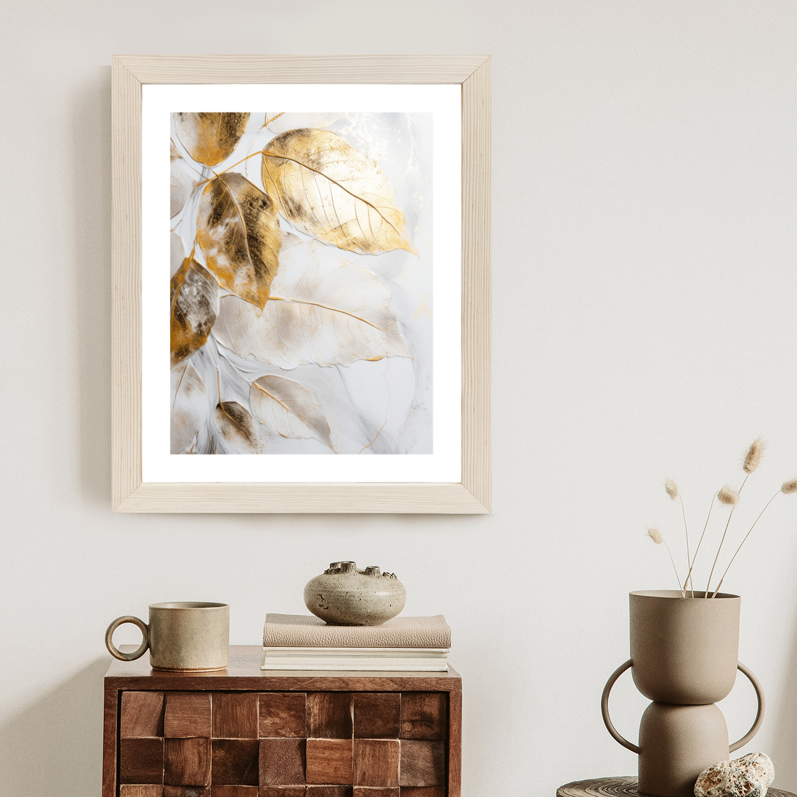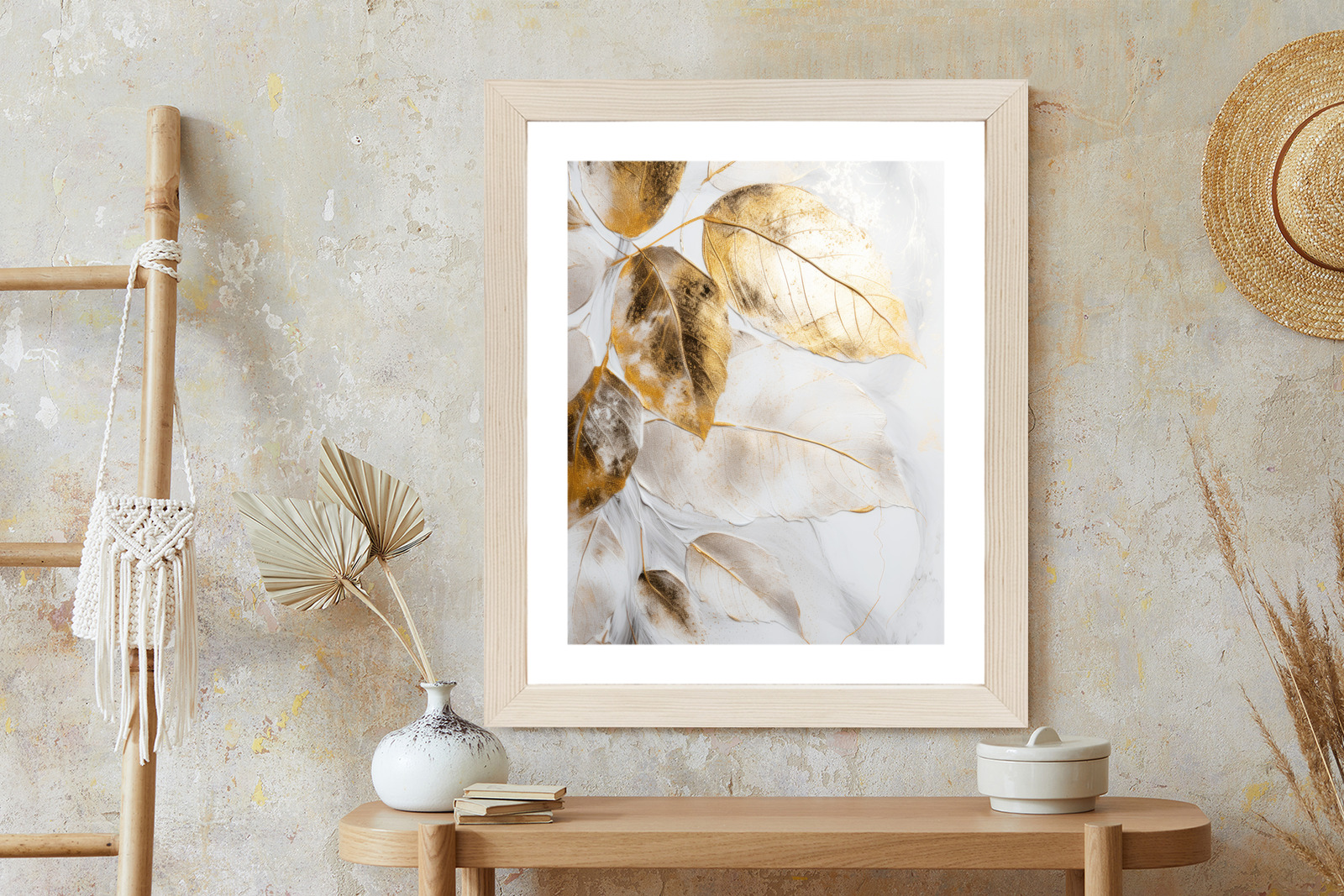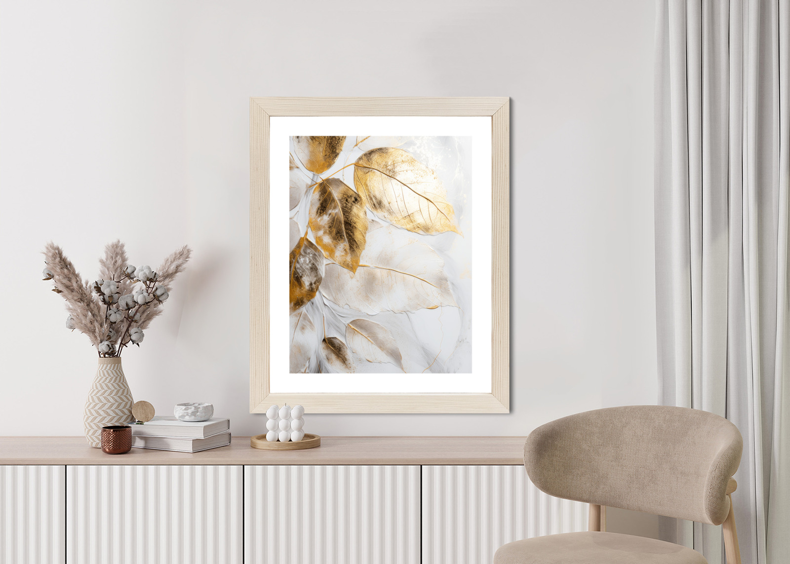 Golden leaves on a bright background in a glamour style. A subtle poster that brightens the interior and adds elegant shine.
