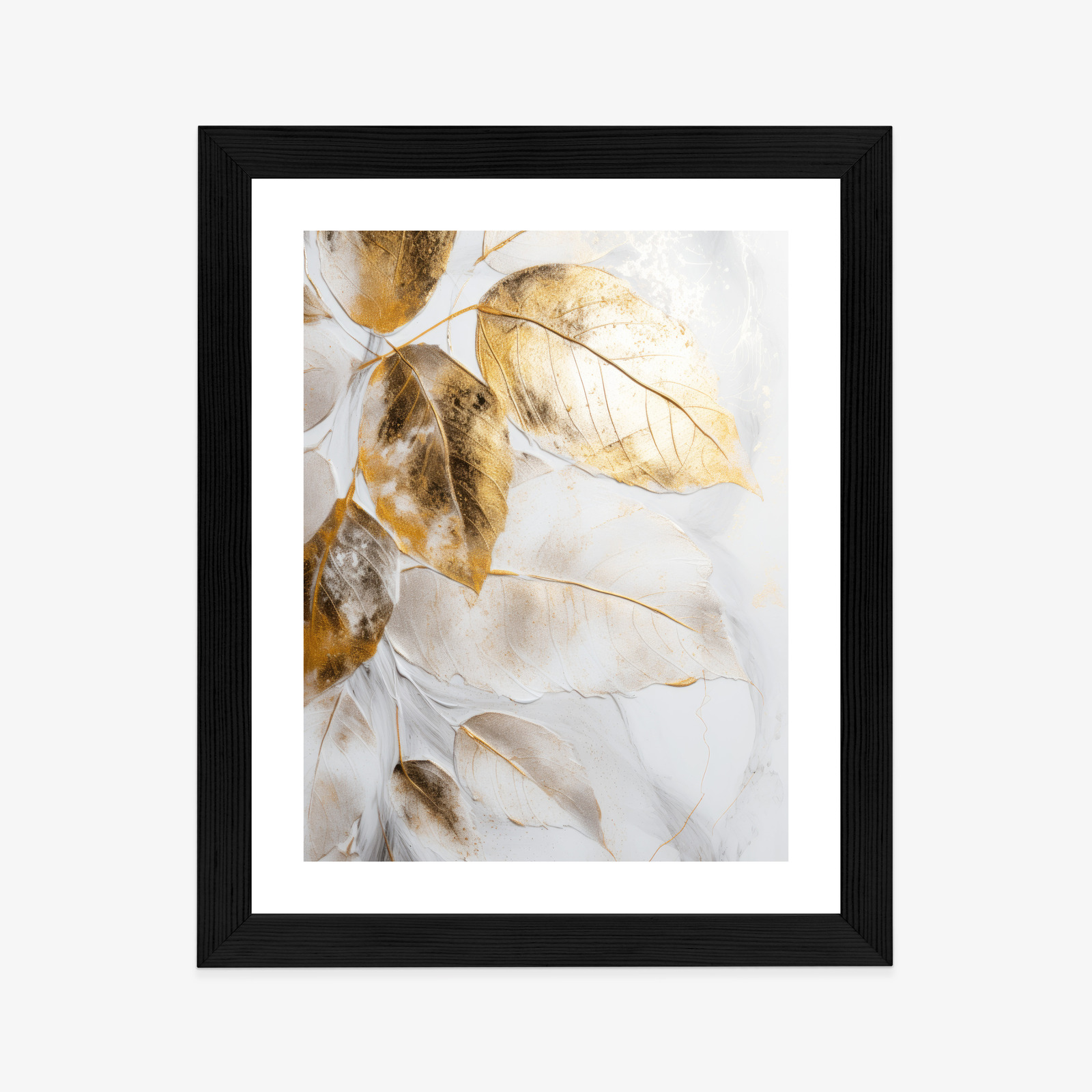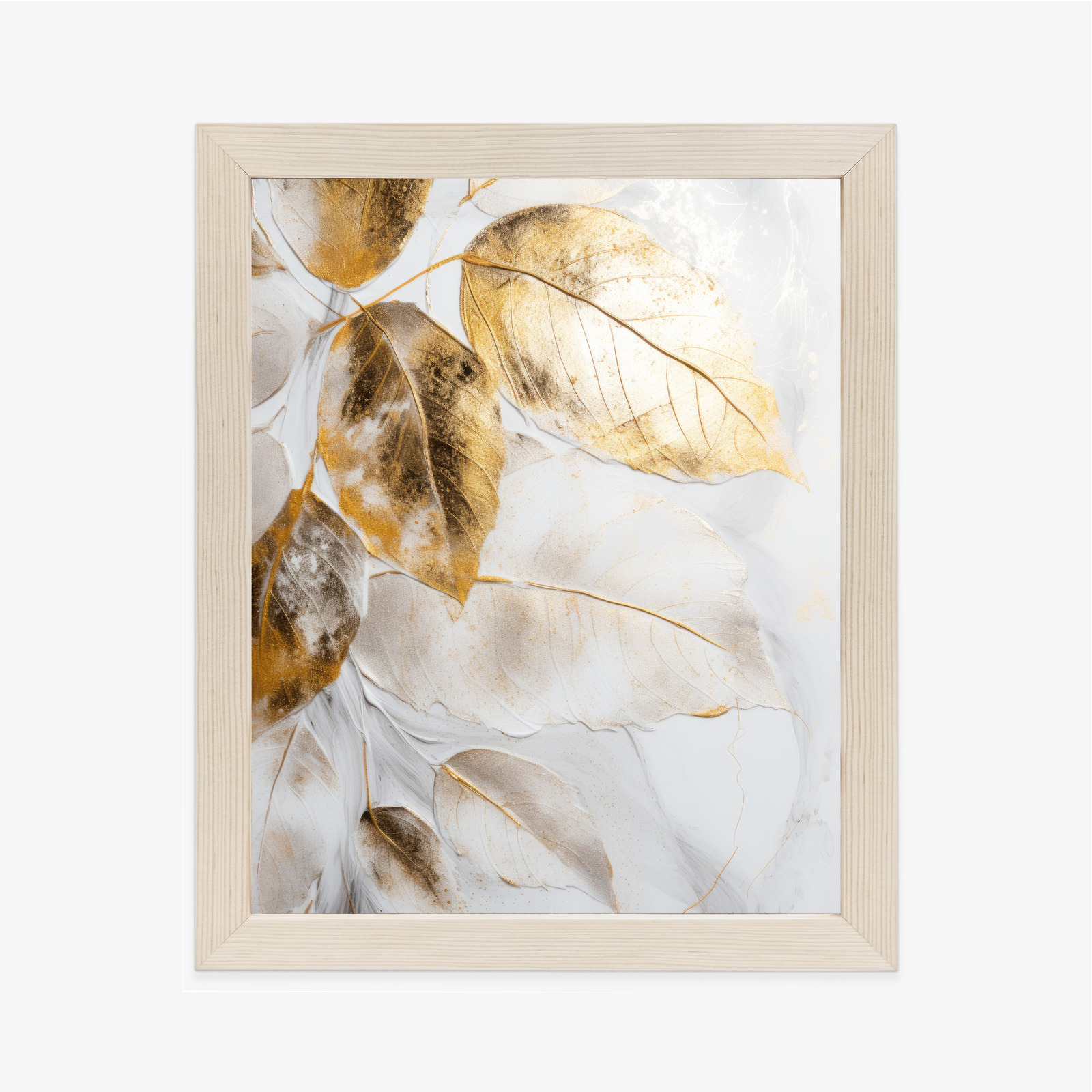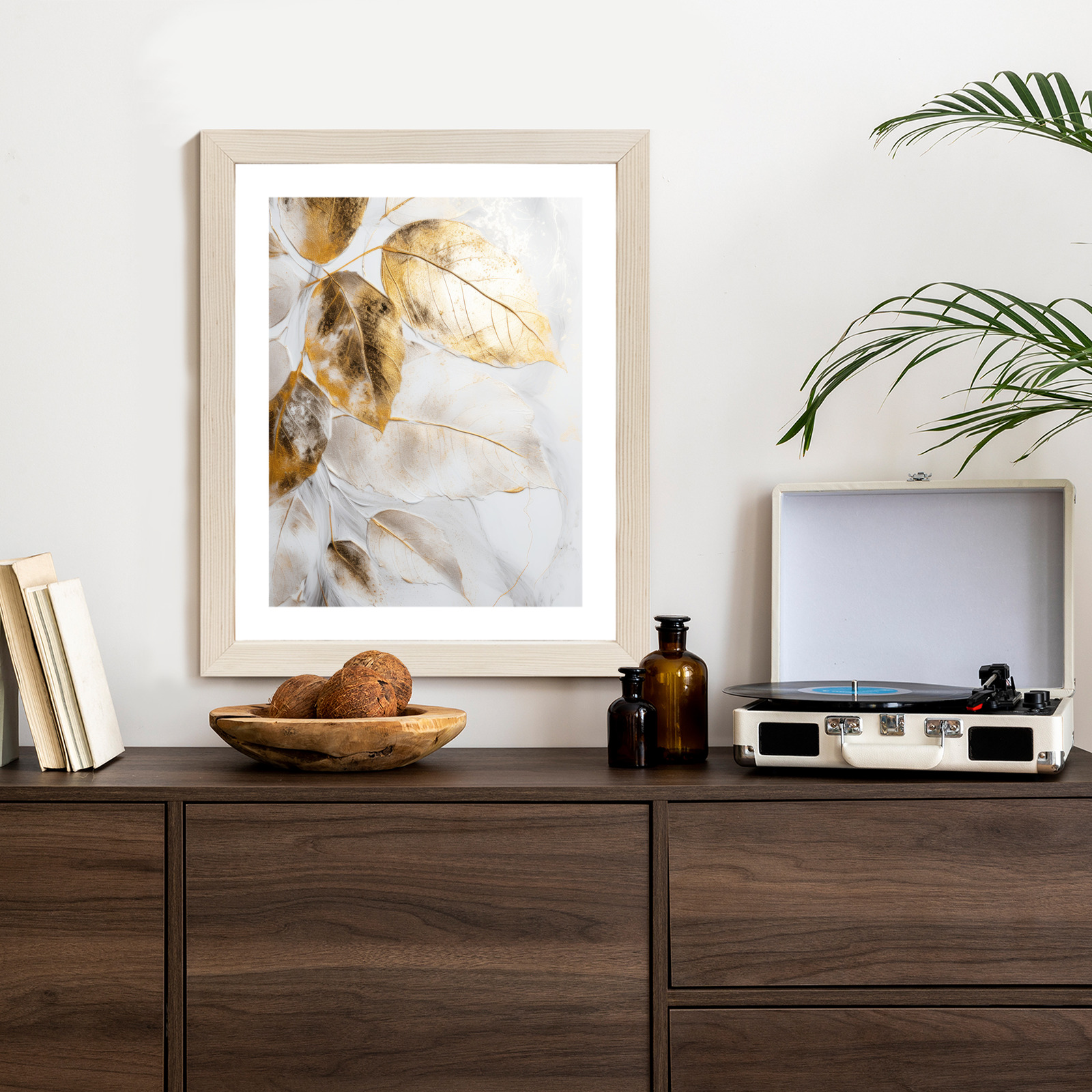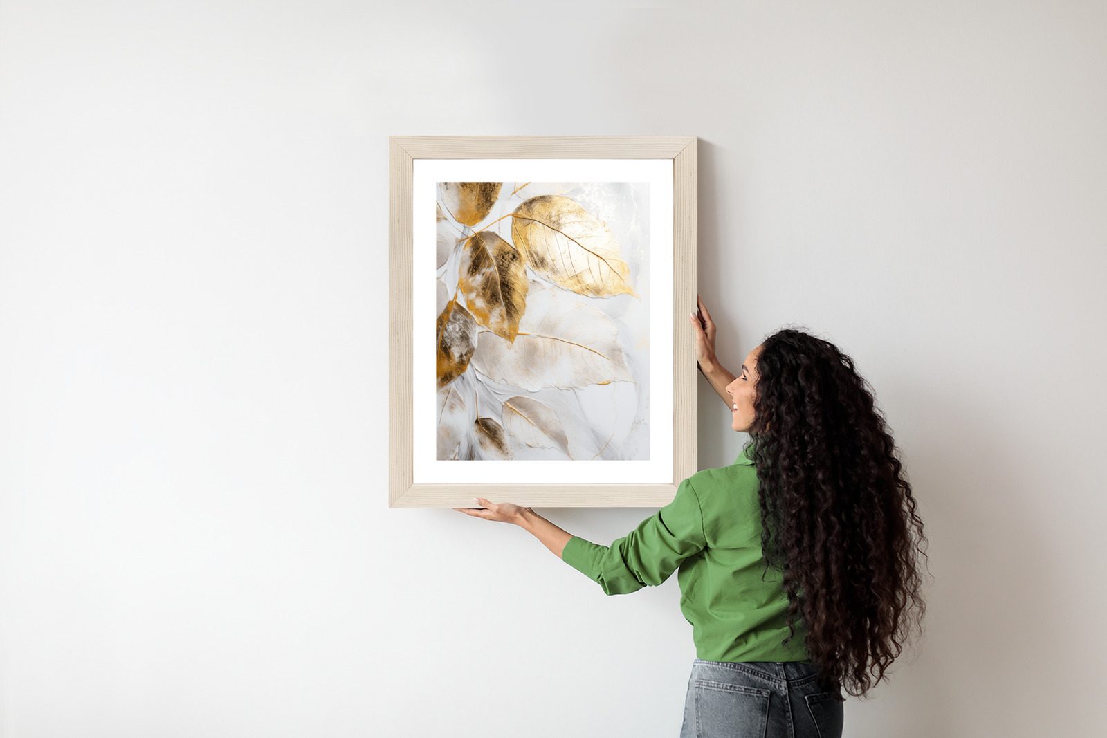 Golden leaves on a bright background in a glamour style. A subtle poster that brightens the interior and adds elegant shine.