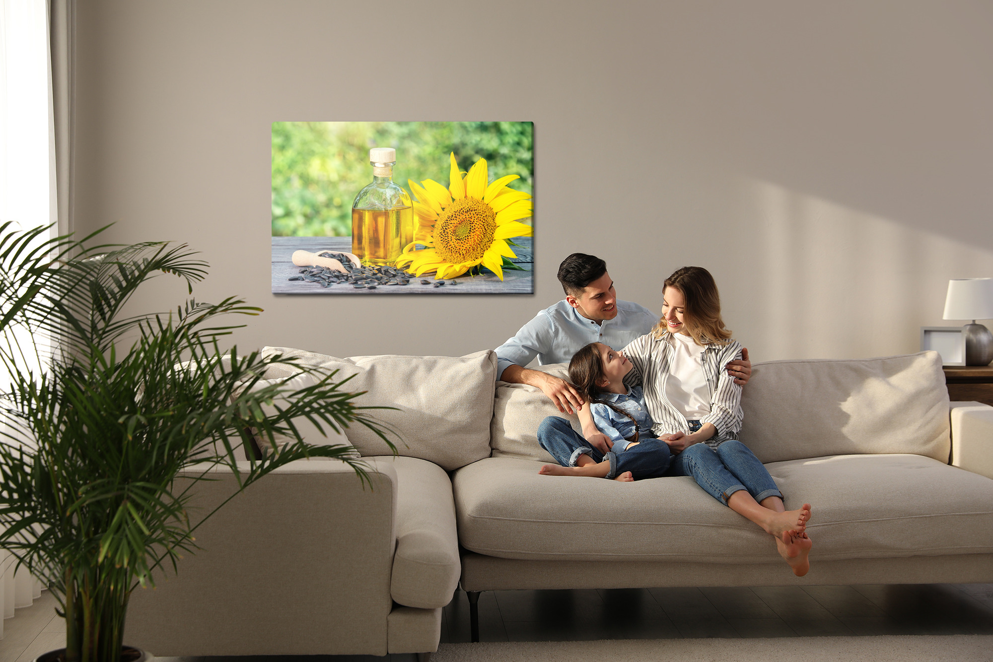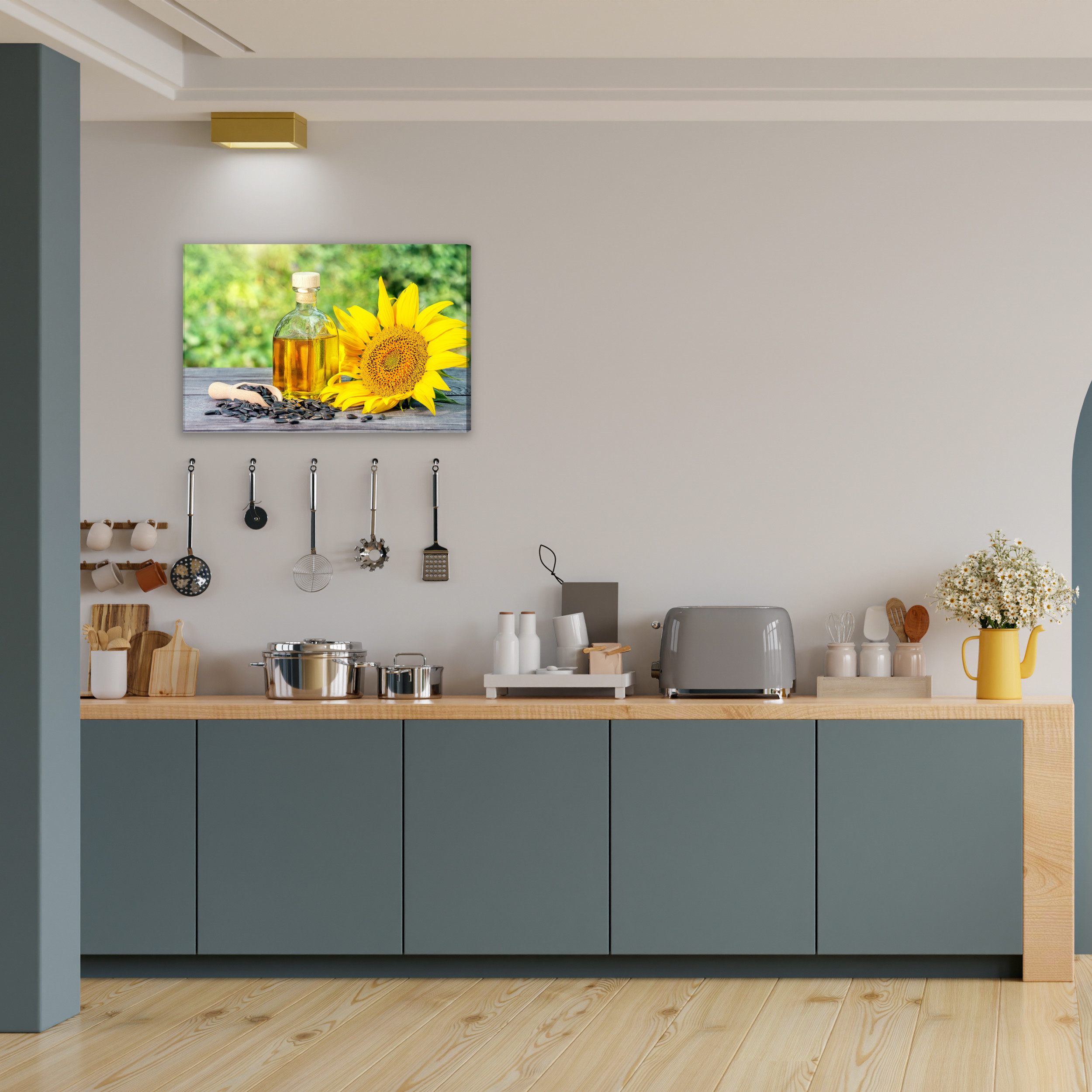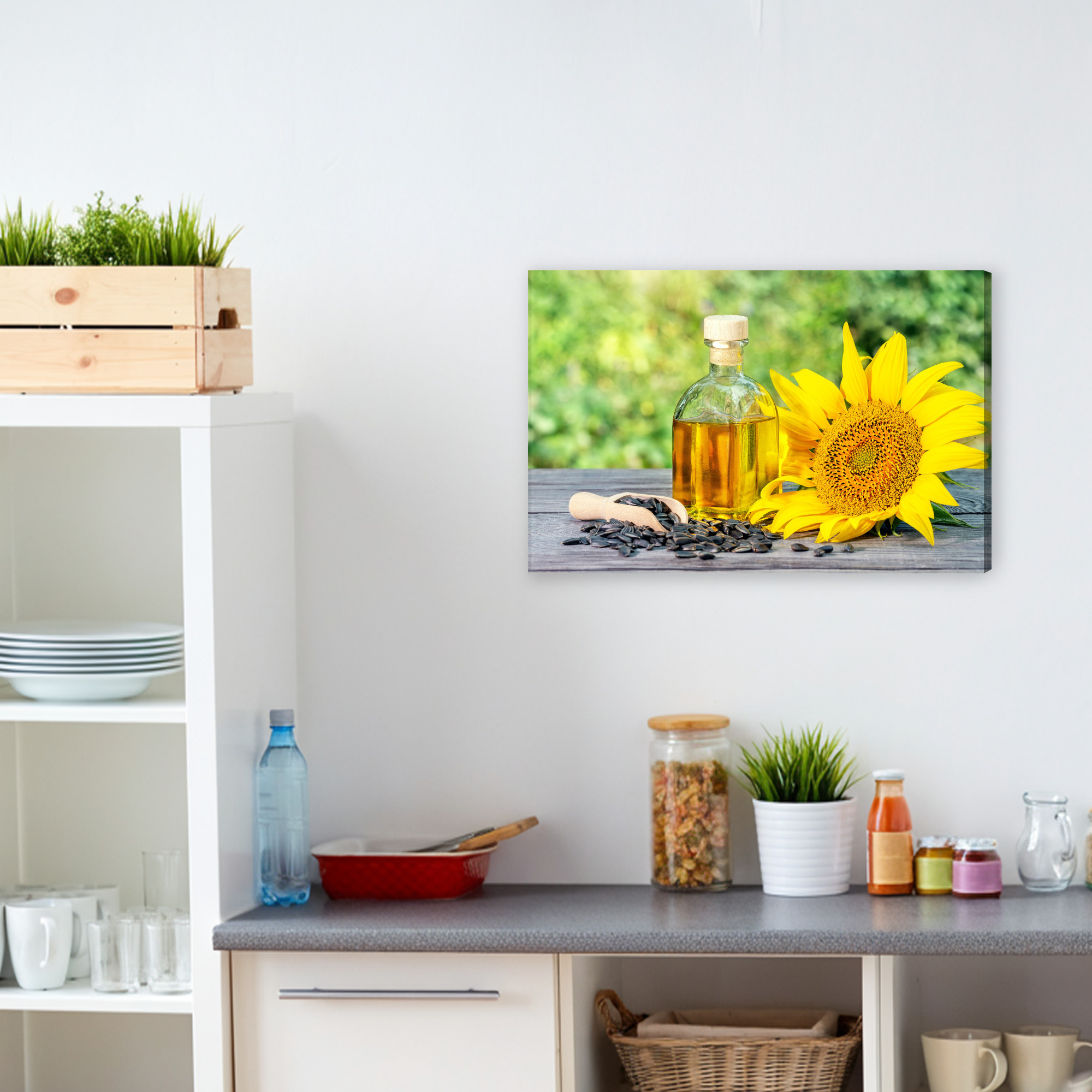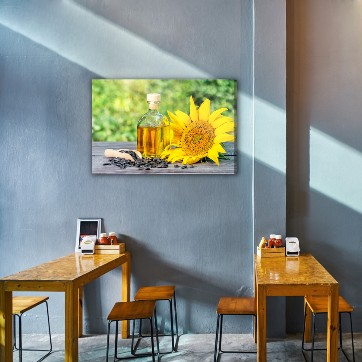 This canvas wall art shows a sunflower in full bloom alongside a bottle of golden oil on a wooden tabletop, with scattered seeds in the frame. The composition feels bright and natural, with sunny yellows and warm gold tones blending beautifully with a soft, green blurred background. This wall decor brings energy, freshness and a nature-inspired mood into your space. It works perfectly in the kitchen, dining area and restaurant, and also in a hotel or office when you want a cozy, healthy accent. A stylish choice for a living room if you enjoy warm, optimistic colors.