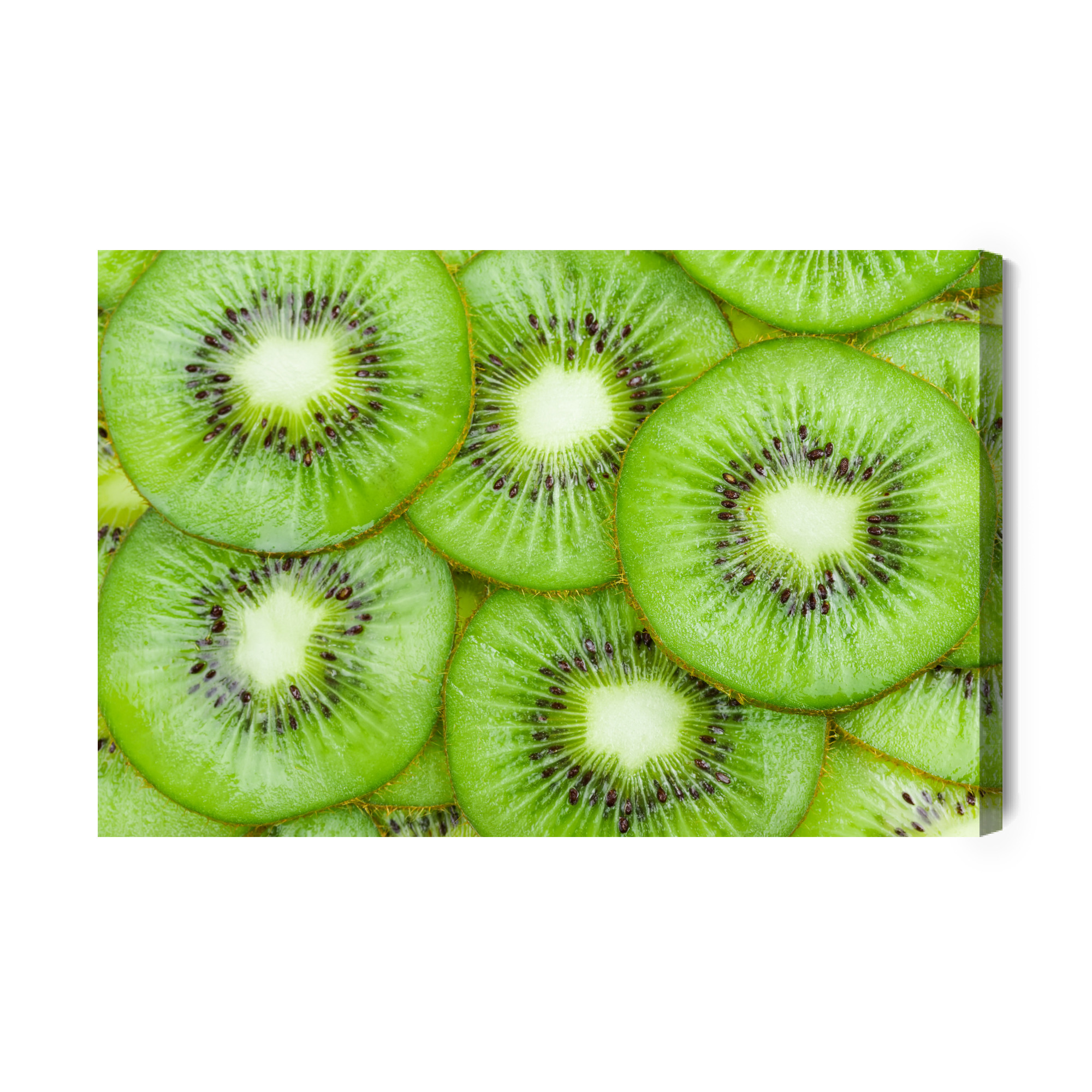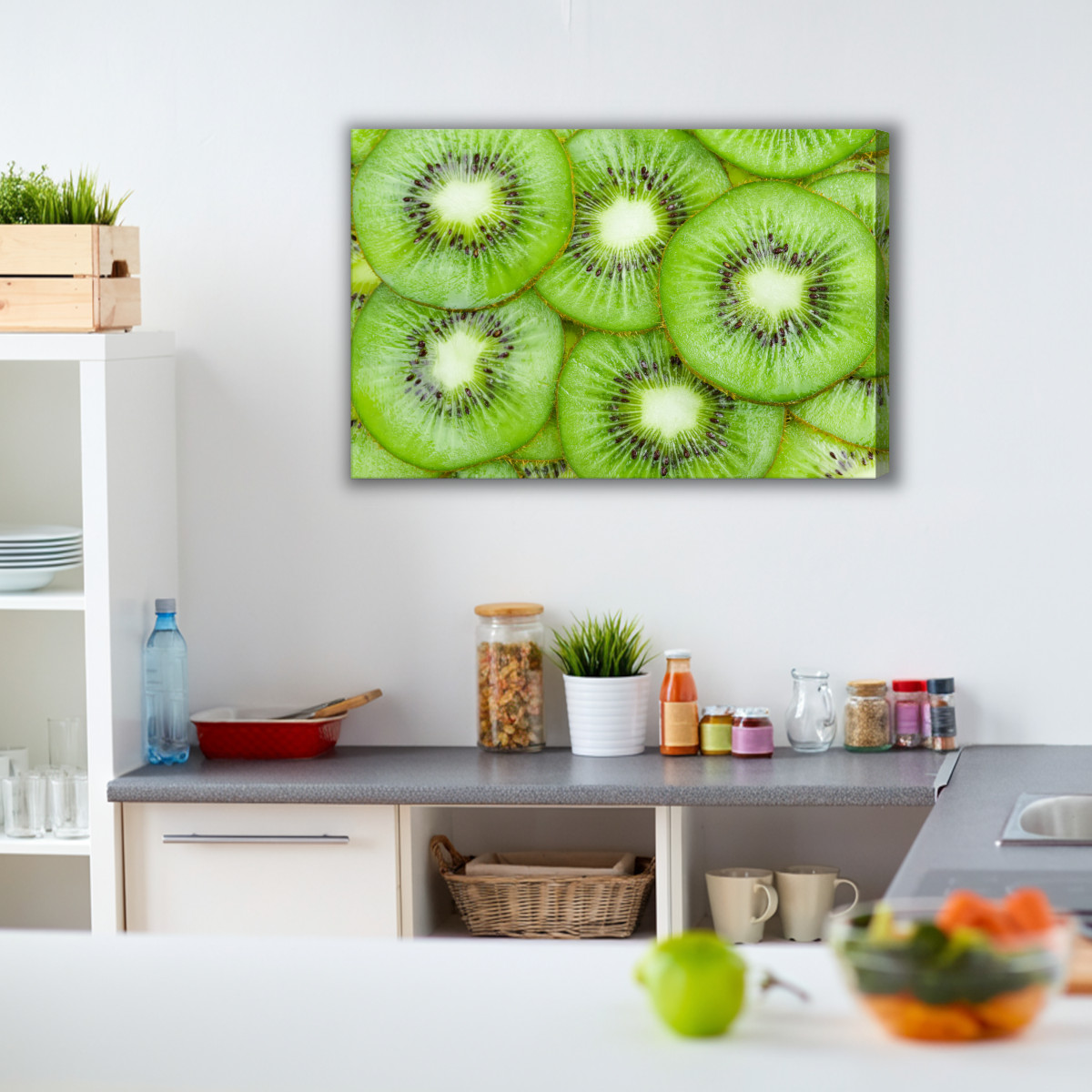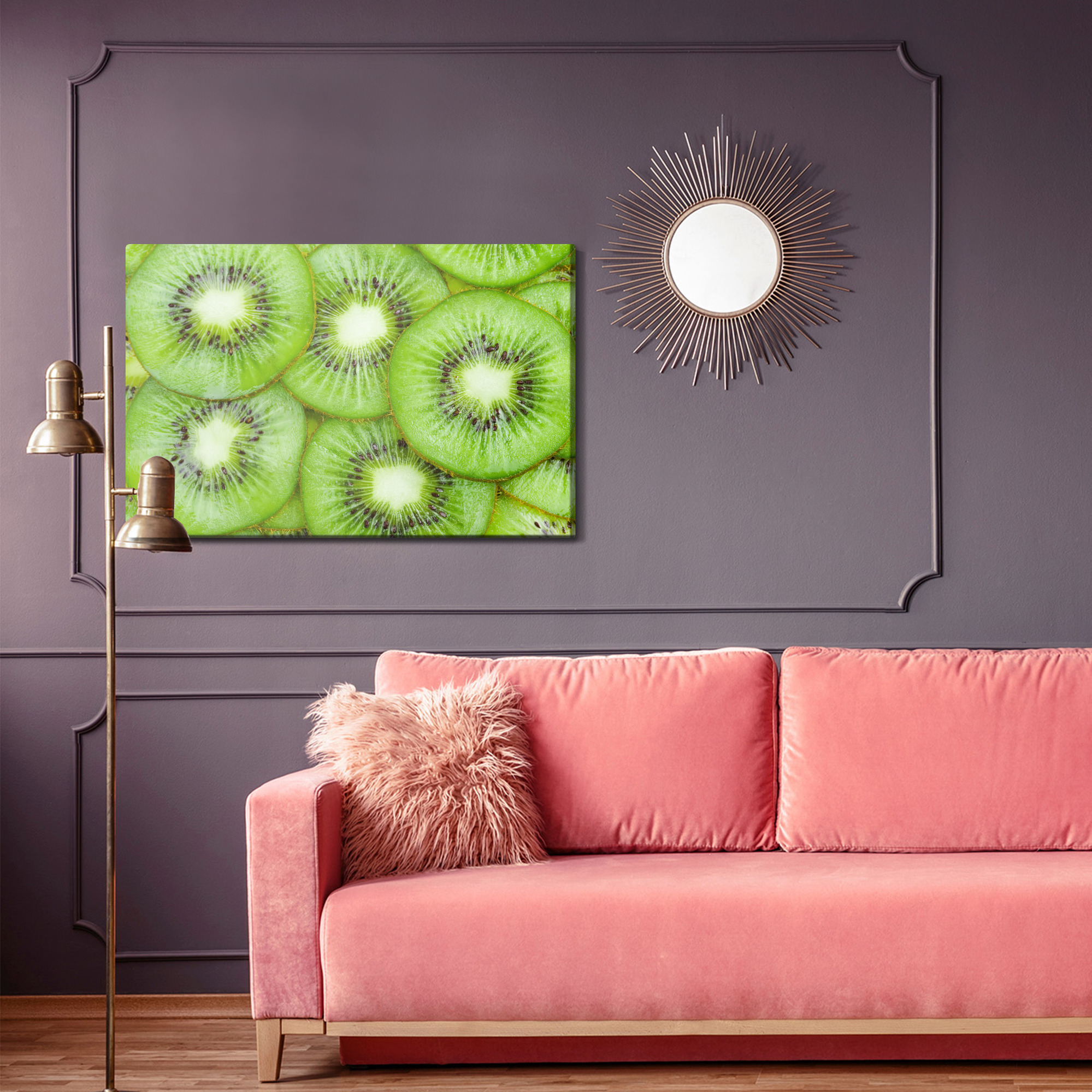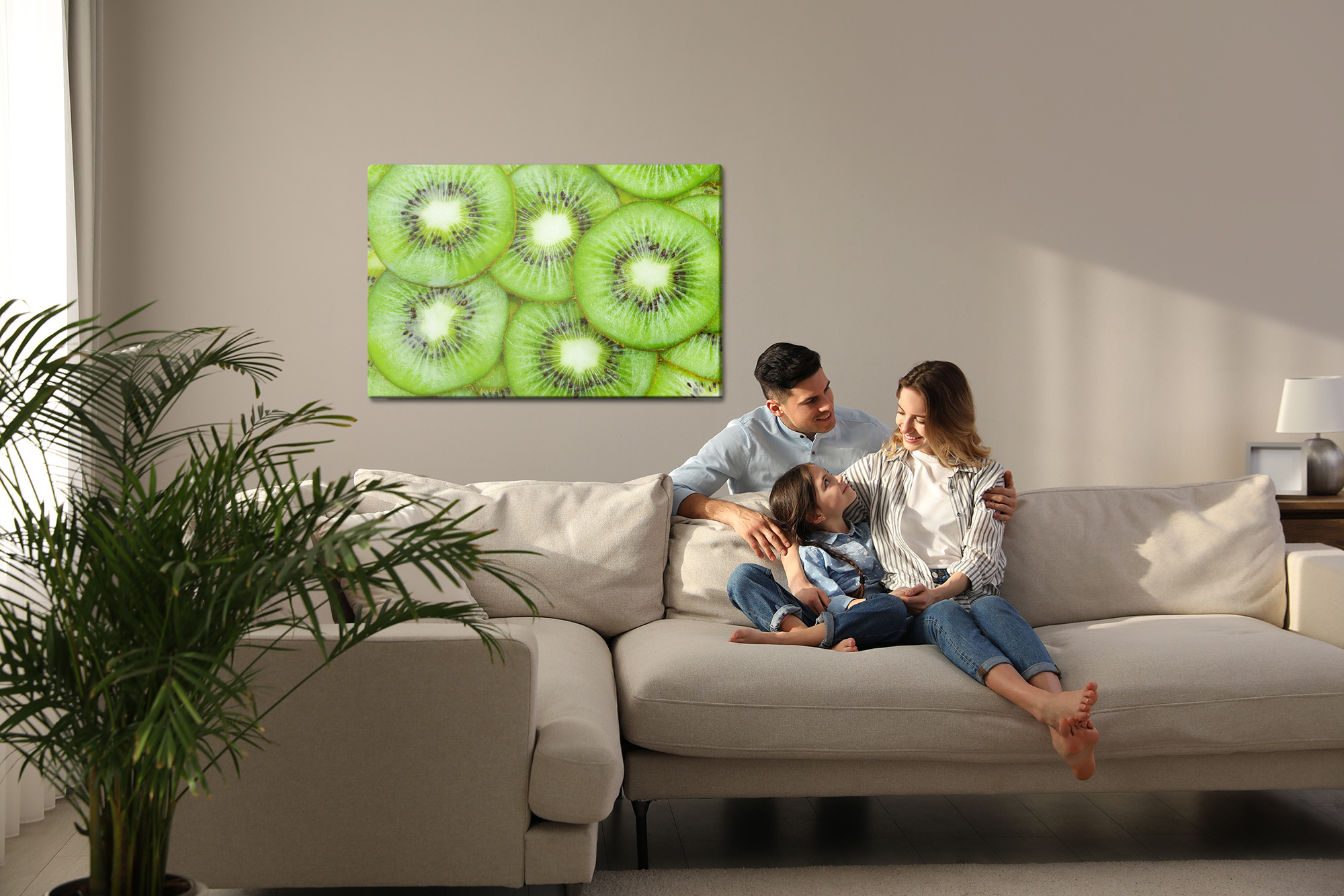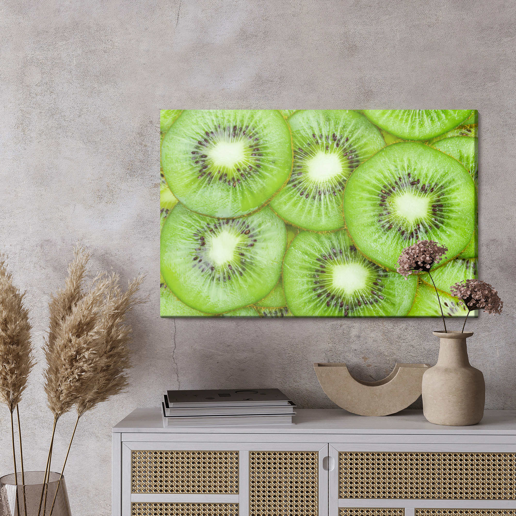 This canvas print is a burst of freshness captured in a macro frame. Layered kiwi slices create a mesmerizing pattern, with delicate rays of fruit flesh and tiny seeds adding a pleasing rhythm to the composition. It is a photo canvas print that instantly catches the eye with intense greens and natural energy, while staying versatile enough to fit many interiors. If you are looking for wall art that brightens the space and lifts your mood, this motif works like a visual dose of vitamins.