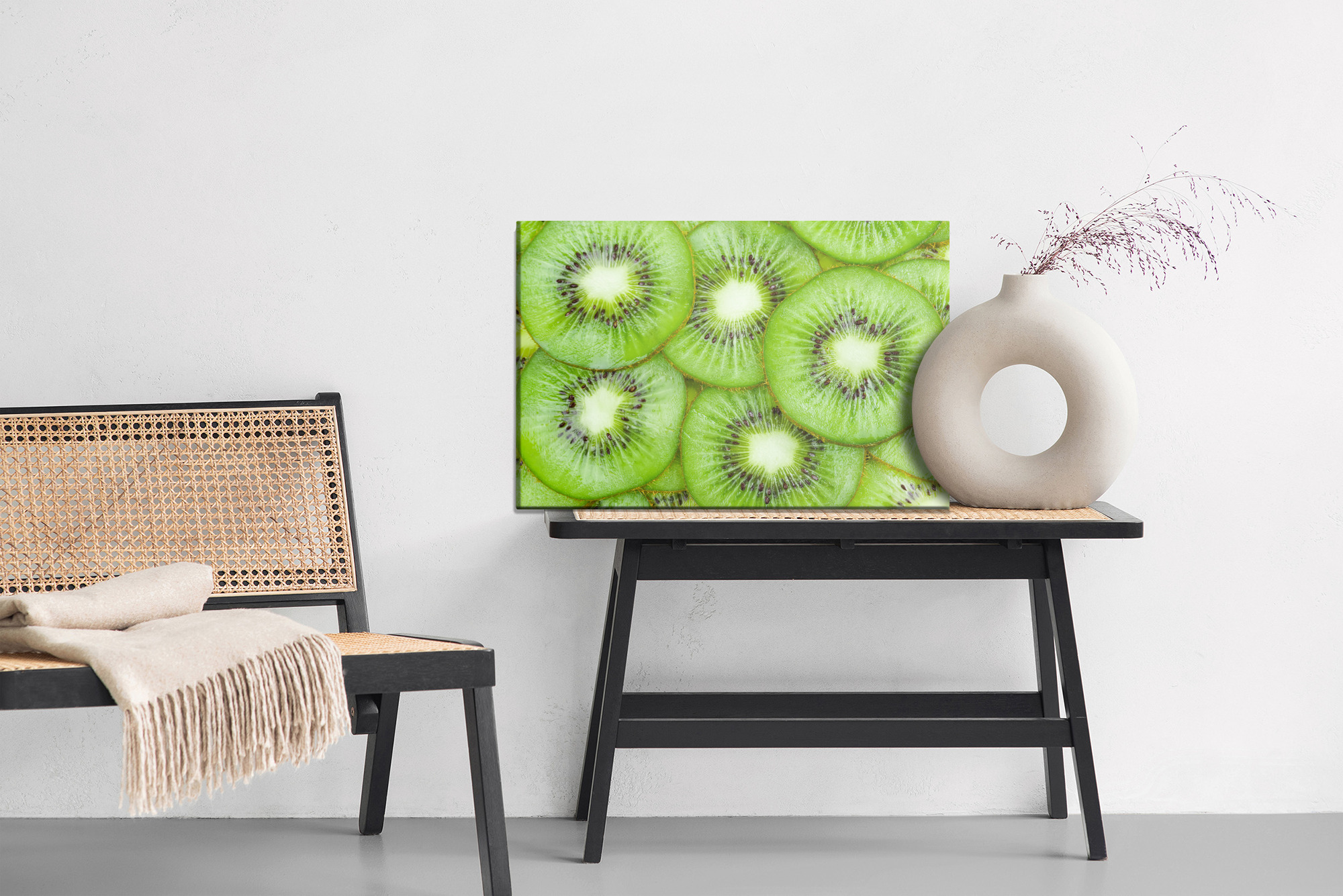 The color palette is bright, juicy, and energetic, dominated by greens with soft transitions into the pale center and contrasting dark seeds. That is why this type of wall art suits modern, minimalist, and Scandinavian interiors, as well as commercial spaces where a clean, fresh message matters. It is wall decor that feels tidy and harmonious while still adding a bold accent. Choose the size that fits your wall and let this kiwi motif become a light, optimistic backdrop for everyday life.