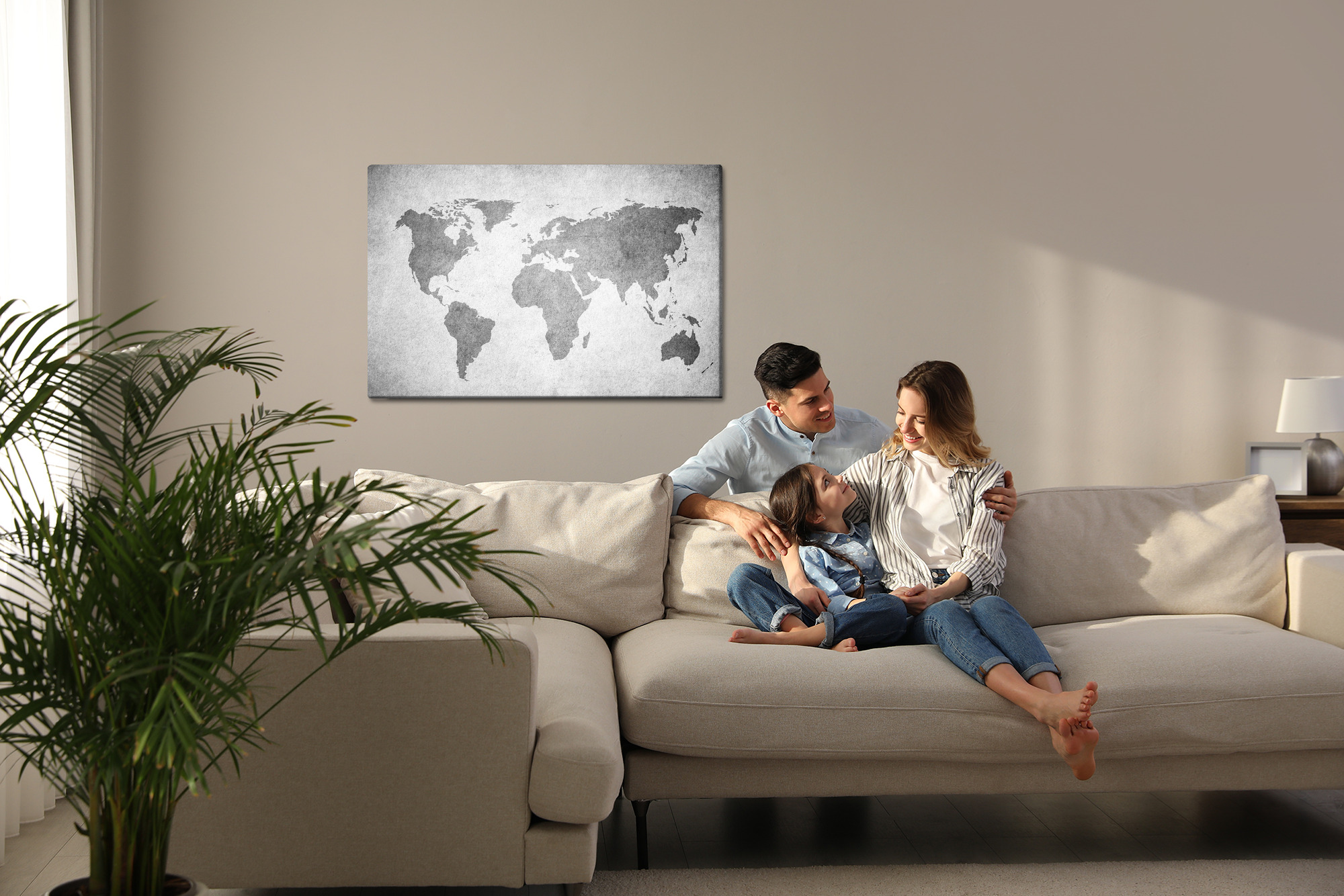 A minimalist world map on canvas is a strong yet versatile accent for modern interiors. Continents in graphite grey contrast with a light background and a subtle concrete texture, giving the wall art a stylish, timeless look. It is a perfect living room canvas that creates a travel mood and inspires new plans. It also suits an office, bedroom, hallway, hotel or restaurant, especially in industrial, Scandinavian and minimalist spaces.