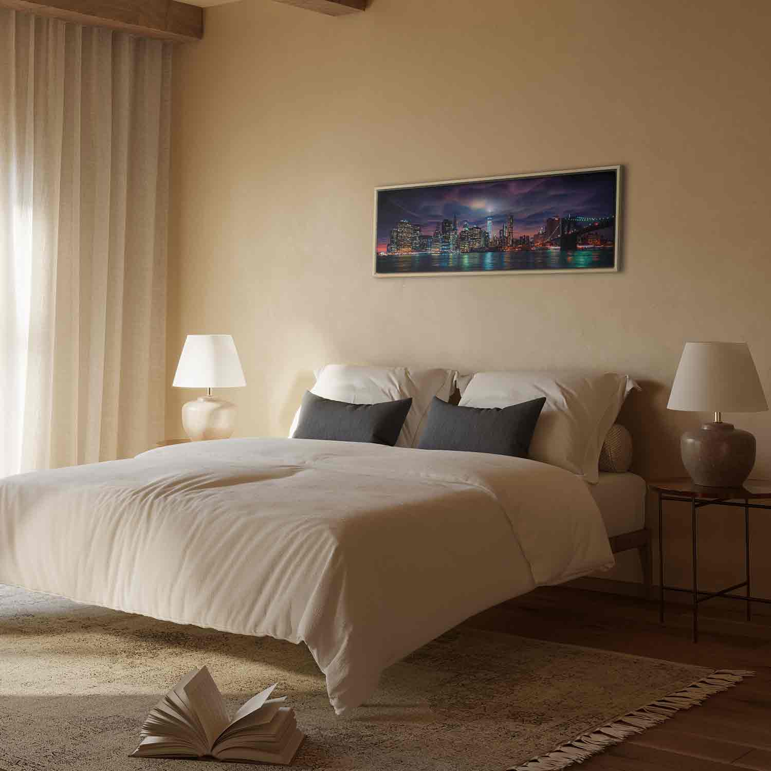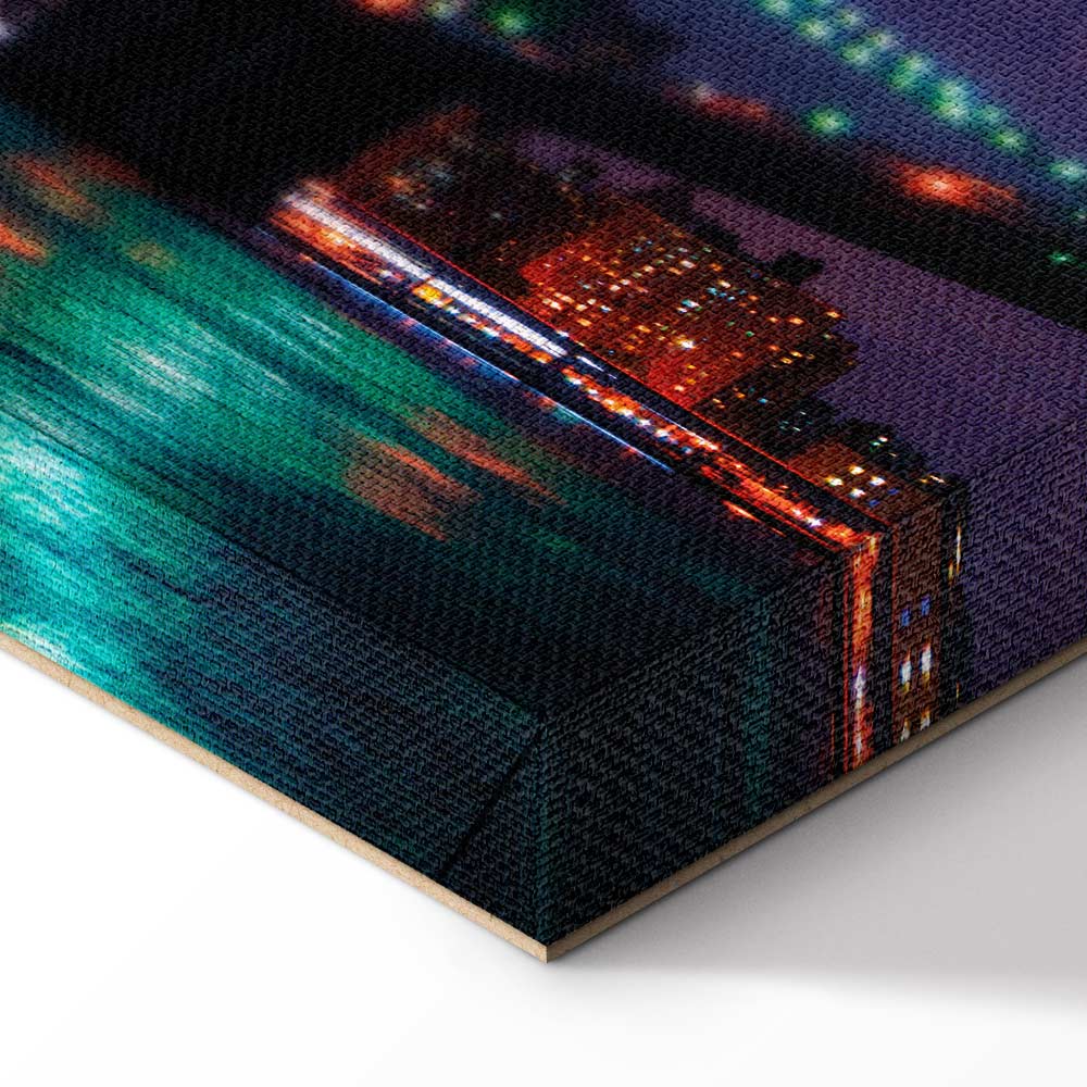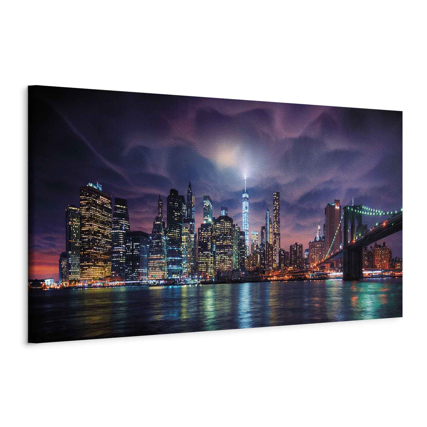 This wide canvas print with the New York skyline at night captivates with its modern character and spectacular light effects. Illuminated Manhattan skyscrapers, the bridge and reflections of colourful lights in the water create a dynamic composition full of energy, elegance and big city atmosphere. Intense shades of navy blue, violet, blue and warm lights beautifully enliven the interior, giving it distinctiveness and a modern style. It is a striking decoration for the living room, office, hotel, restaurant or hallway, perfect for loft, modern and industrial interiors. This wall art draws the eye and creates the unique atmosphere of New York, the city that never sleeps.