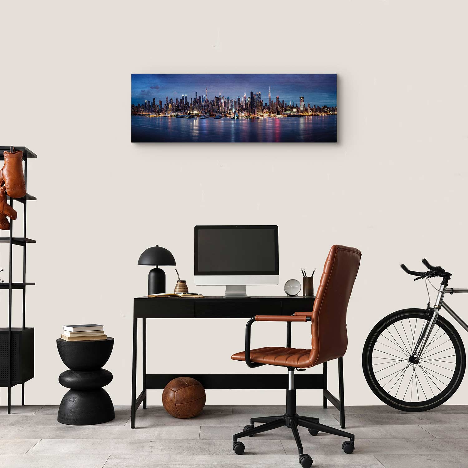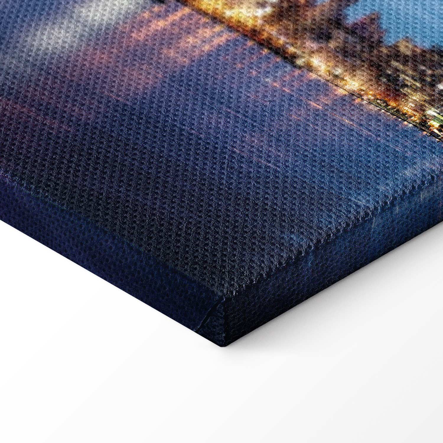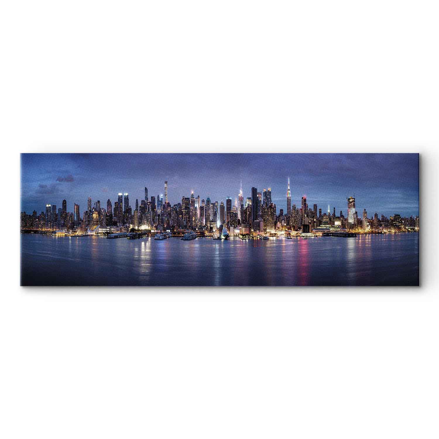 This wide canvas print with the New York skyline at dusk captivates with its elegance, modern style and the unique glow of a great city. Illuminated Manhattan skyscrapers reflected in the calm surface of the water create a striking composition full of depth, harmony and urban character. Shades of navy blue, blue, violet and warm lights give the interior a distinctive look while creating a stylish, atmospheric mood. It is an excellent choice for the living room, office, hotel, restaurant or hallway, especially for modern, loft and industrial interiors. This wall decoration draws the eye and brings energy, prestige and the atmosphere of New York into the space.