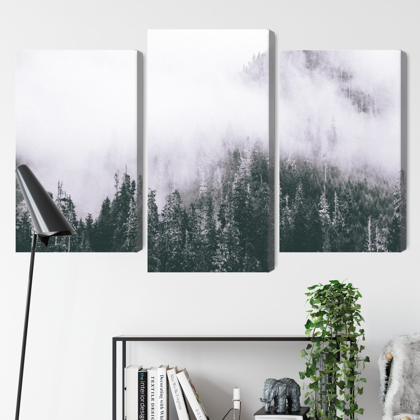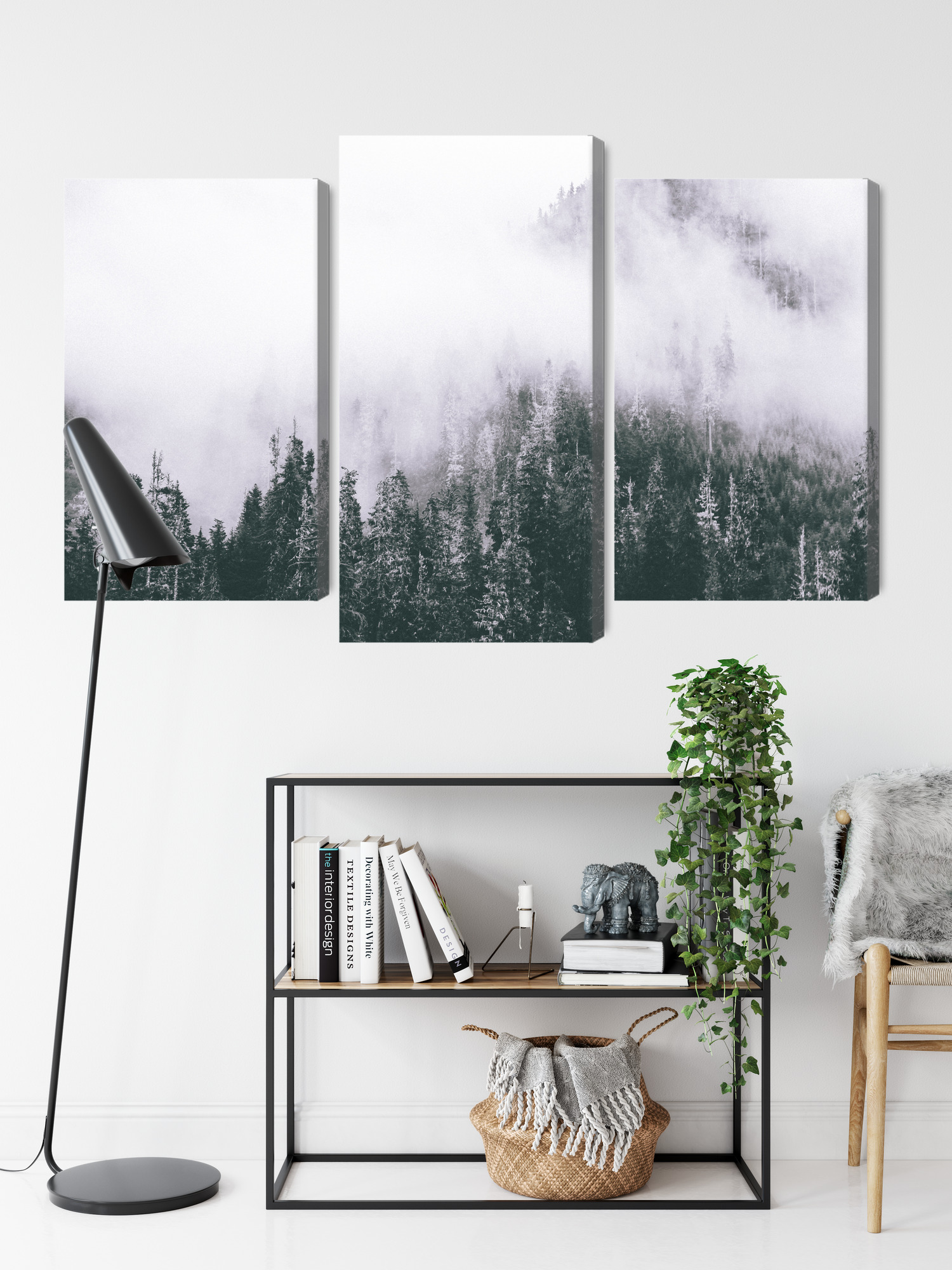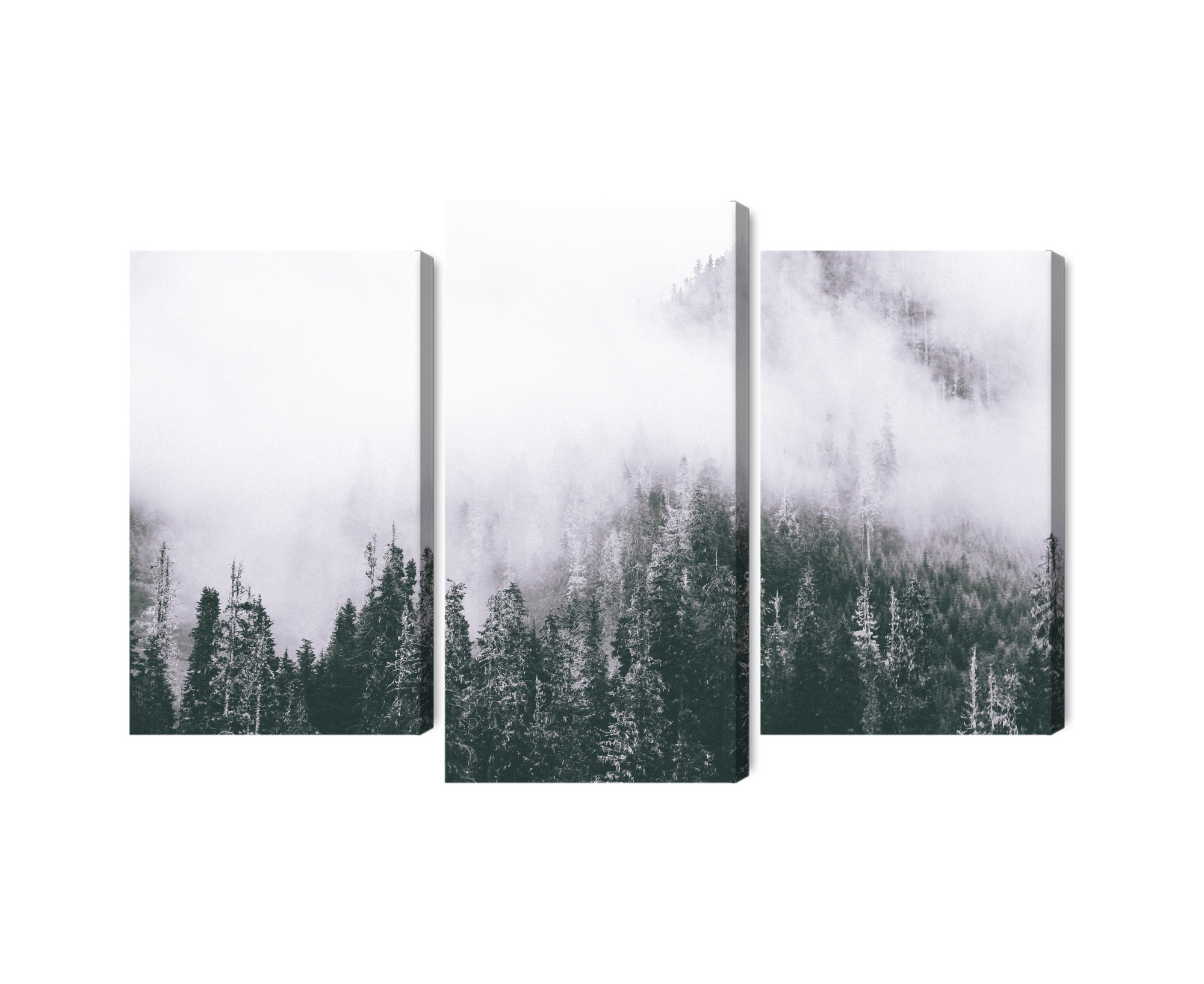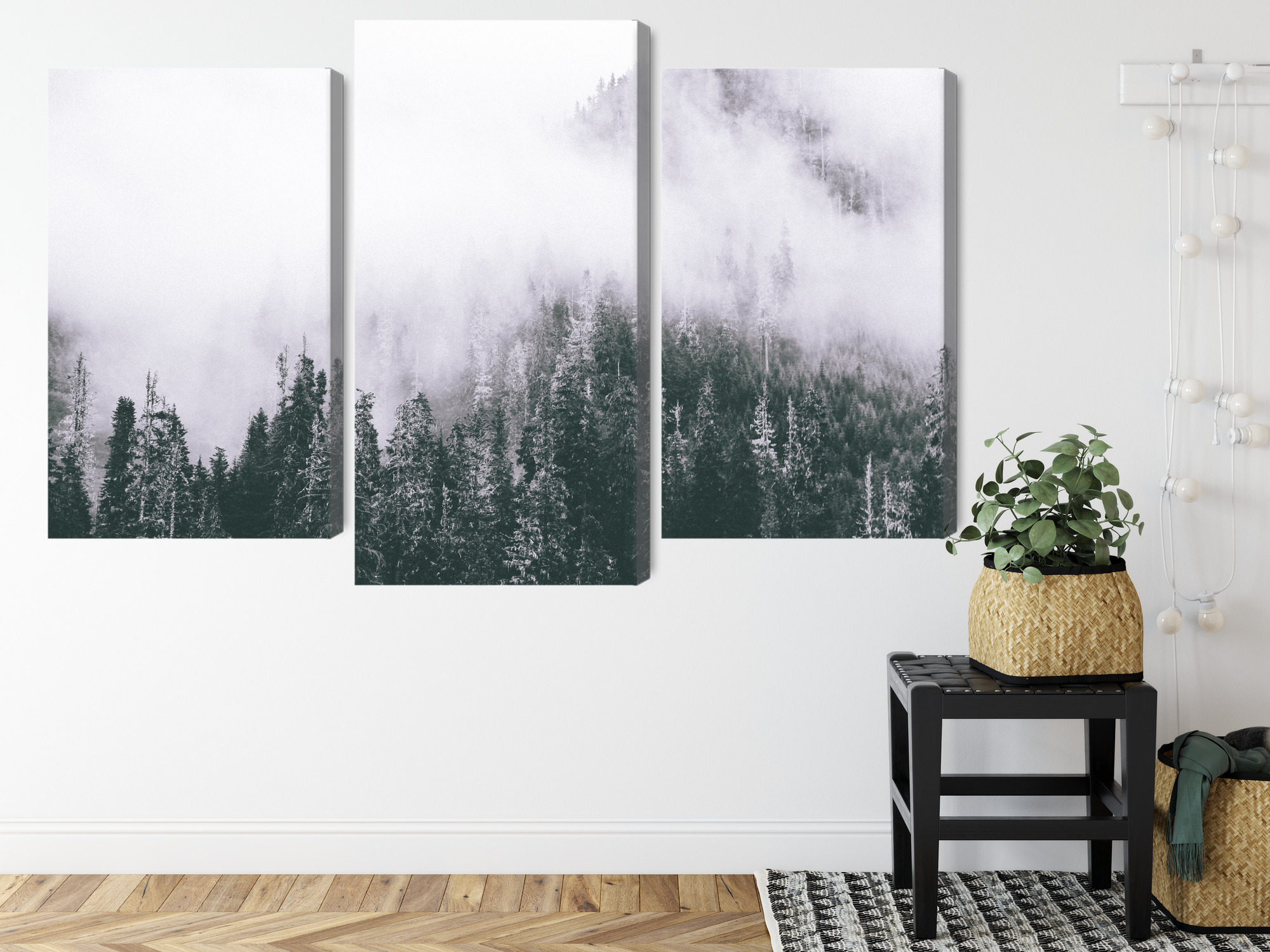 Bring the hush of a mountain morning into your home. This three-piece canvas wall art captures a dense conifer forest wrapped in milky mist—like a slow, breathy moment on a trail when everything gets quiet and clear. The triptych layout adds depth and rhythm: the side panels let the trees fade into soft white fog, while the center panel draws the eye into the most atmospheric, gently shadowed part of the forest. It’s modern wall art that doesn’t shout—this is mood, calm, and elegance on your wall.