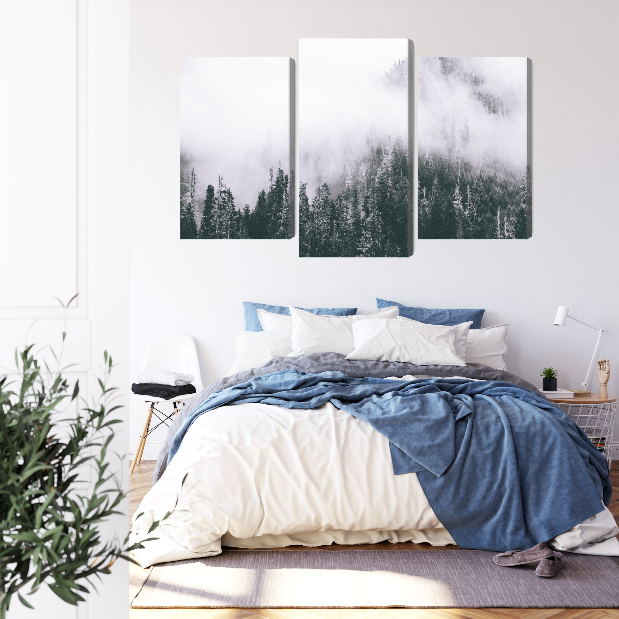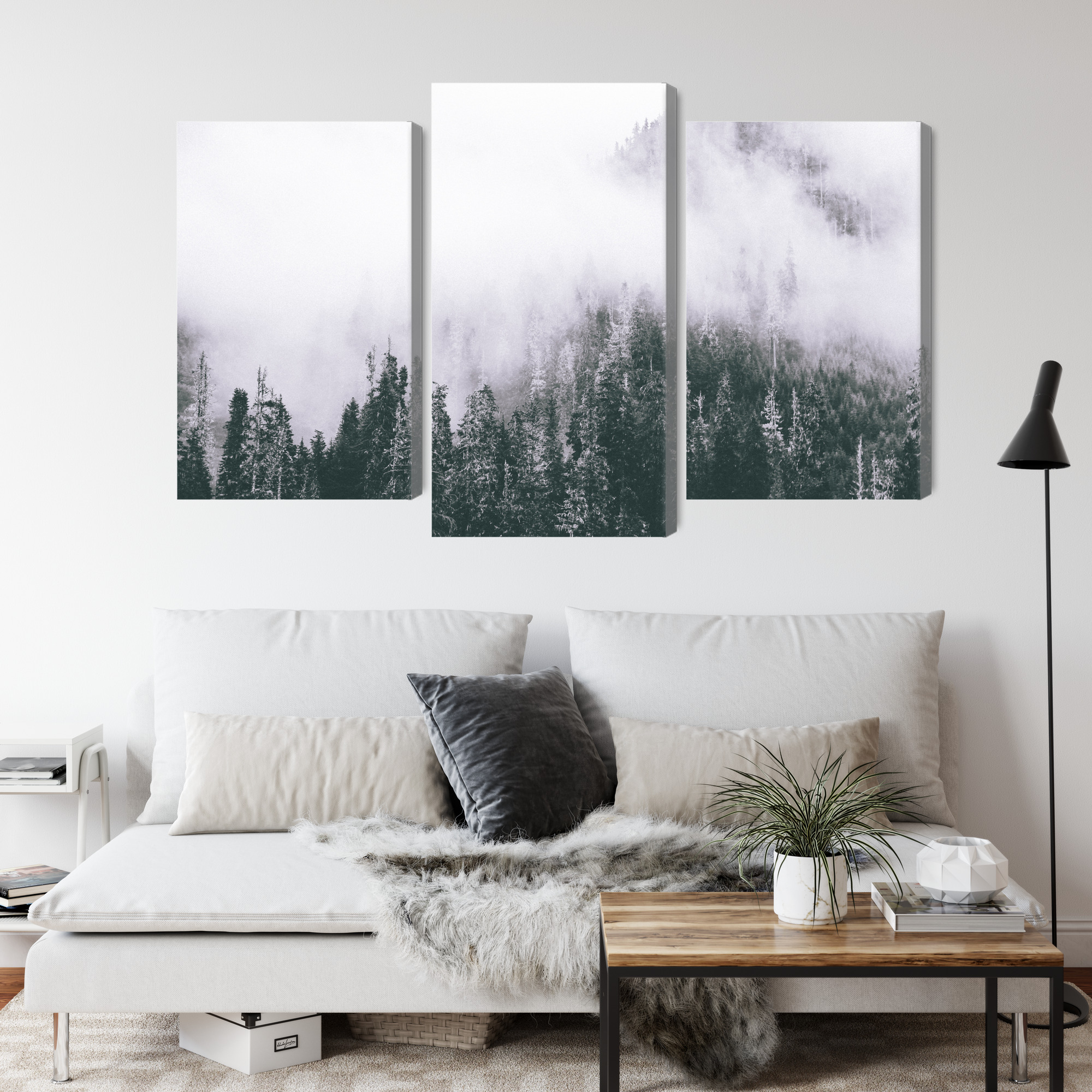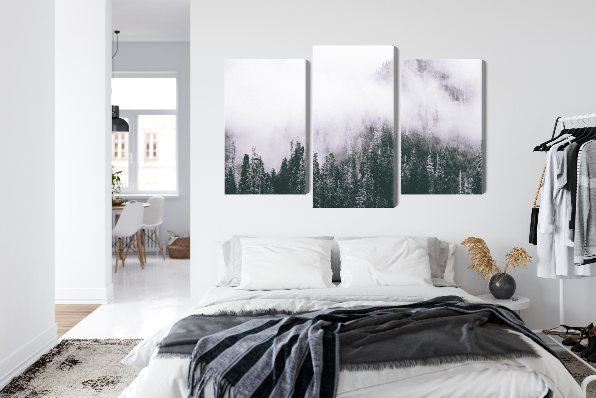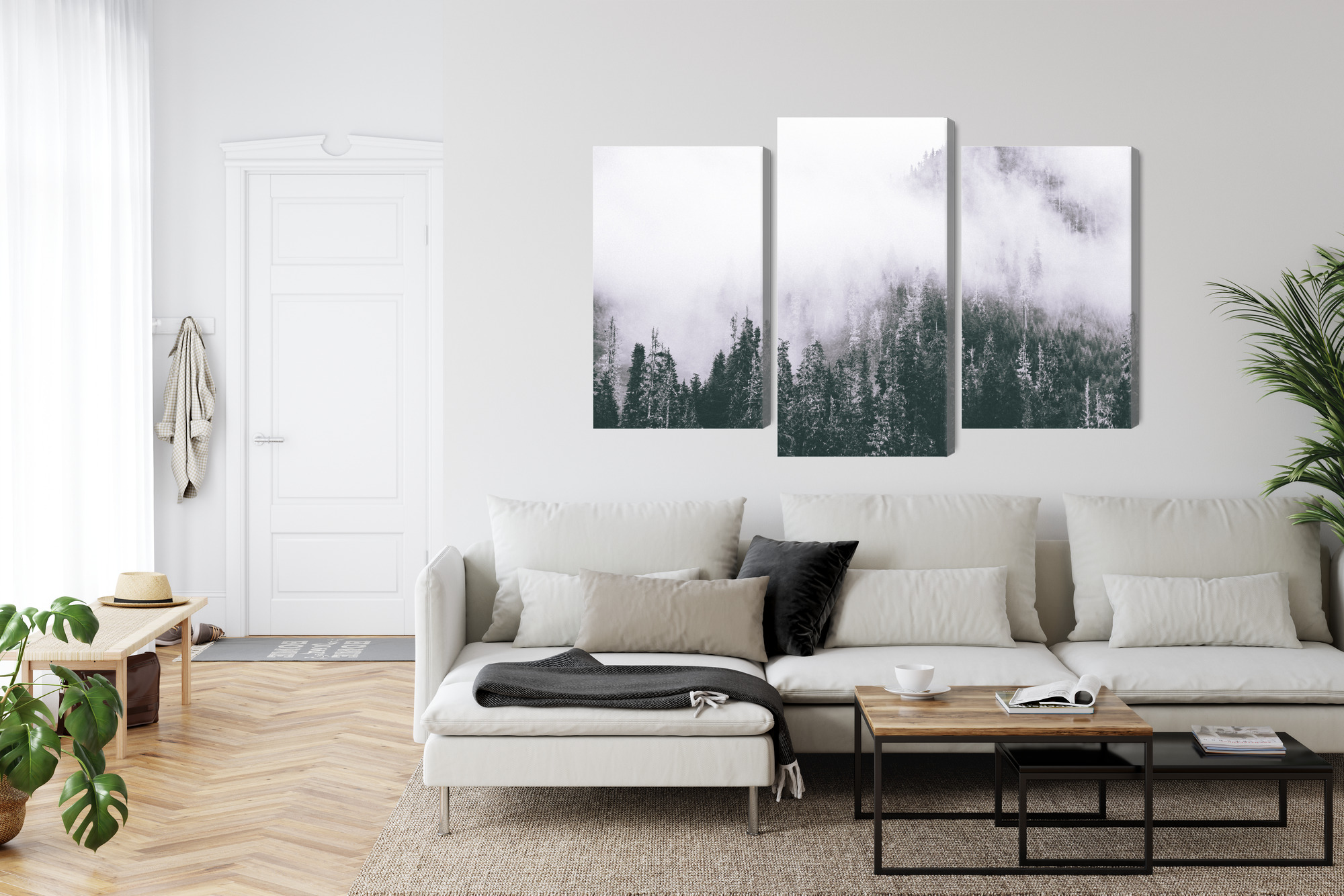 Bring the hush of a mountain morning into your home. This three-piece canvas wall art captures a dense conifer forest wrapped in milky mist—like a slow, breathy moment on a trail when everything gets quiet and clear. The triptych layout adds depth and rhythm: the side panels let the trees fade into soft white fog, while the center panel draws the eye into the most atmospheric, gently shadowed part of the forest. It’s modern wall art that doesn’t shout—this is mood, calm, and elegance on your wall.