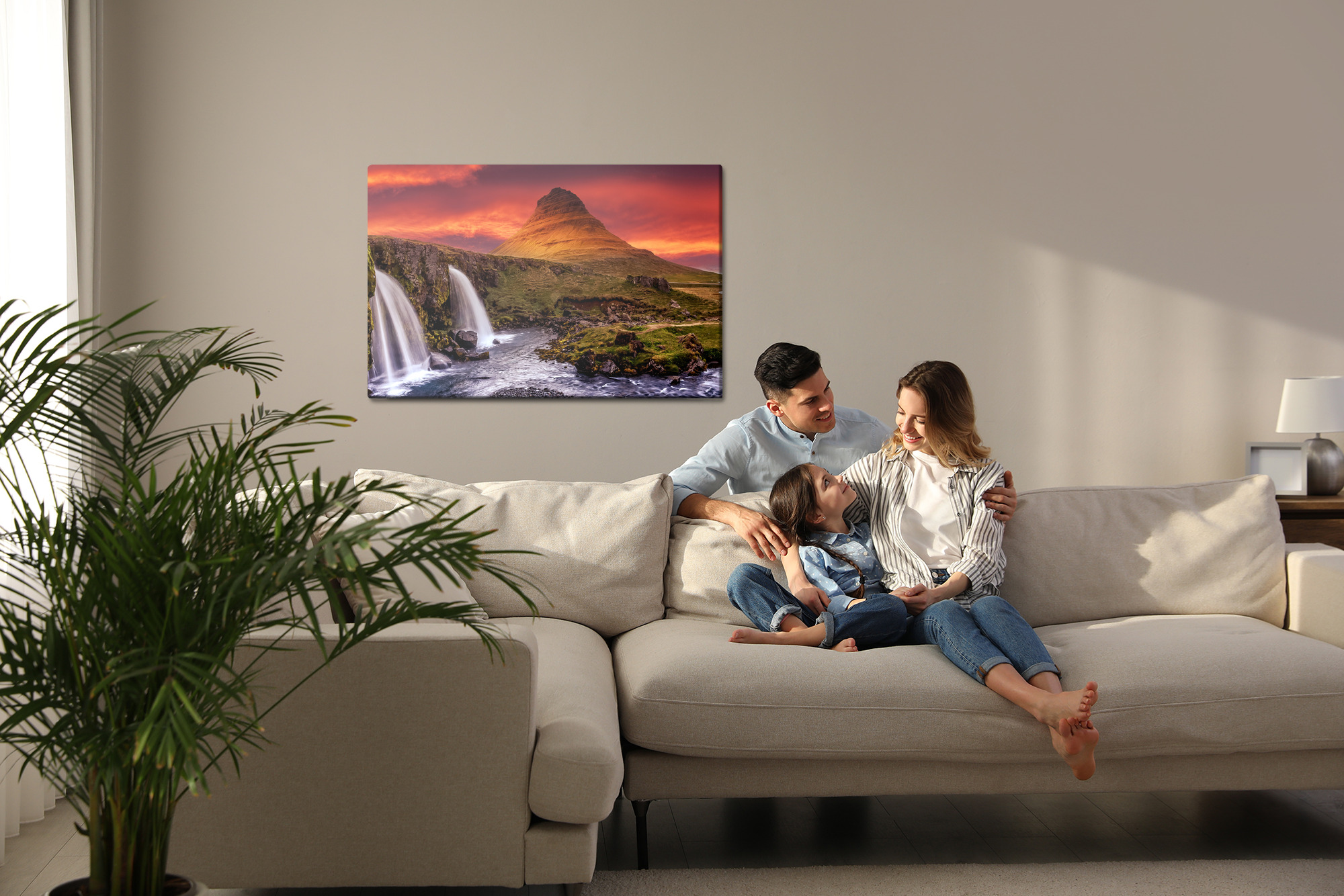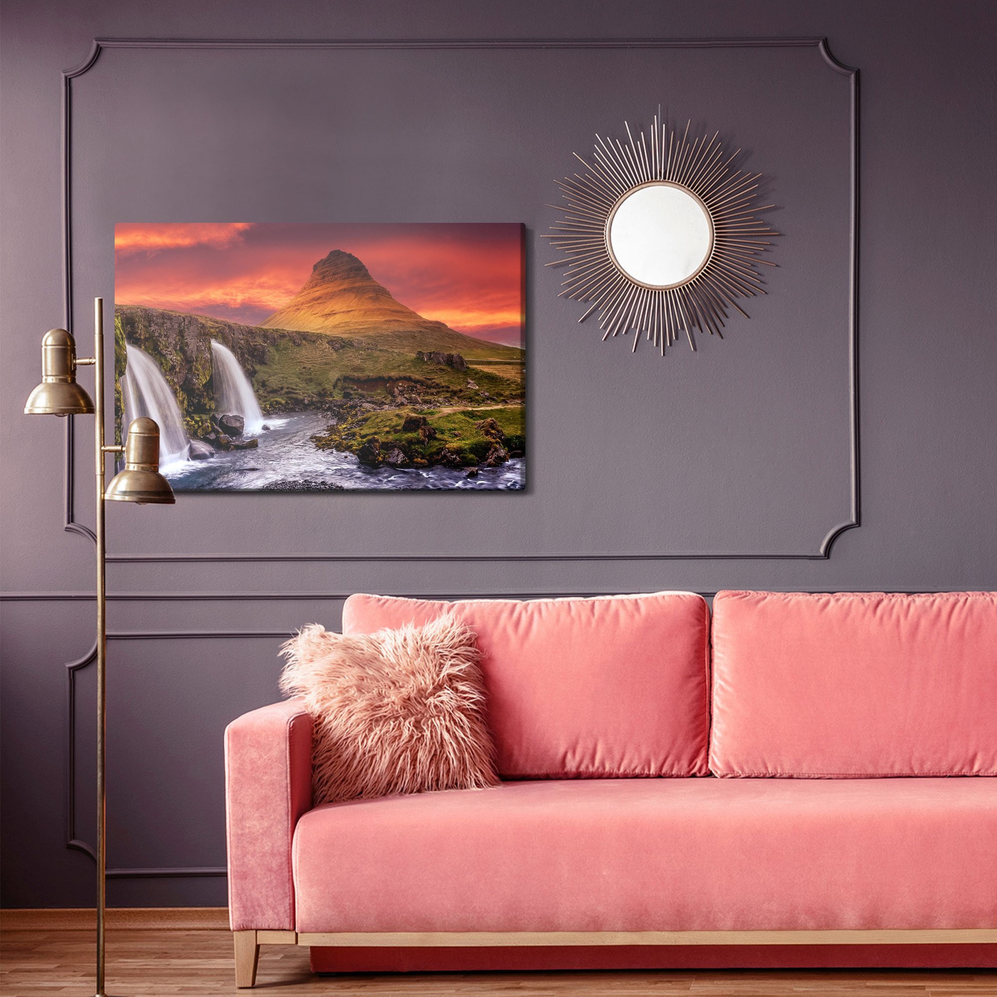 This canvas wall art looks like a frame from a journey to the edge of the world: a majestic cone-shaped mountain rises in the background, while two waterfalls pour into a fast-flowing river in the foreground. The entire scene is wrapped in a spectacular sunset that brings energy, space, and a sense of constant movement into your interior. It’s a perfect wall art for the living room when you want a strong focal point and a statement piece, but it also works beautifully in the bedroom, home office, or hallway. In a hotel or restaurant it becomes an eye-catching wall feature, and in the kitchen or bathroom it adds freshness and a powerful nature vibe.