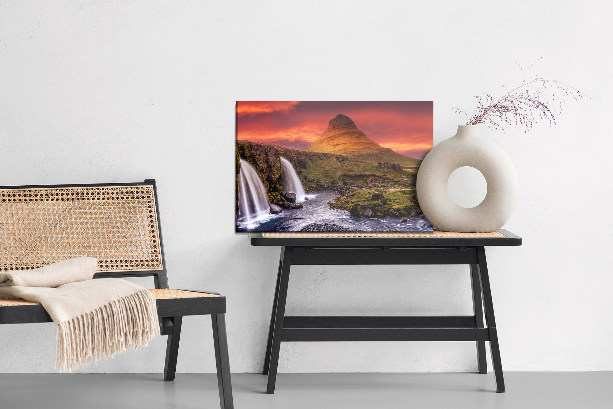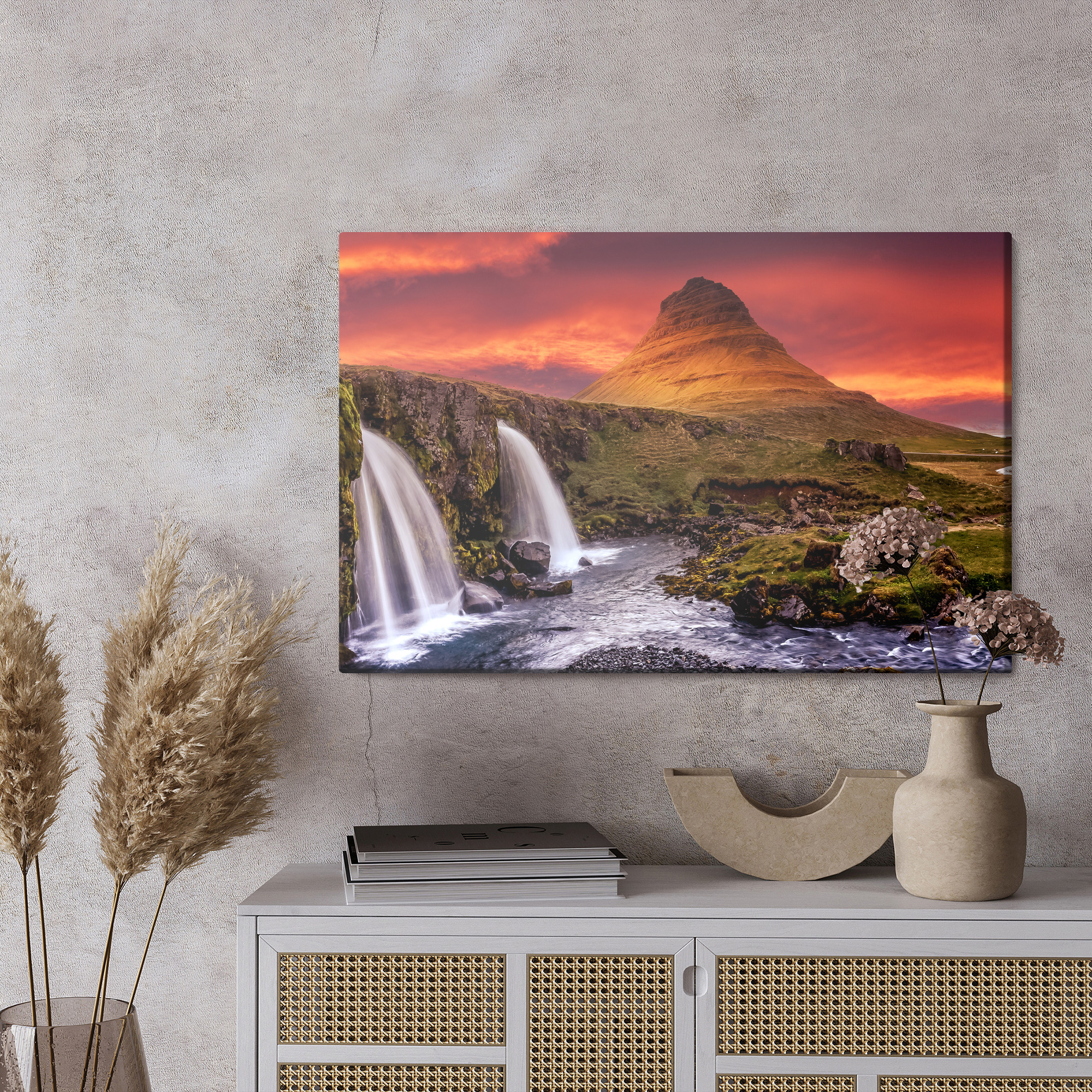 The color palette is bold and high-contrast: the sky in shades of red, orange, and gold warms the room and adds depth, while cooler tones of the water and the bright white cascades balance the composition and give a refreshing sense of breathing space. Mossy greens, grasses, and graphite rocks create a natural base, making this wall art easy to match with modern interiors as well as Scandinavian or industrial styling. It pairs especially well with wood, stone, beige neutrals, and black accents for a coherent, elegant effect.